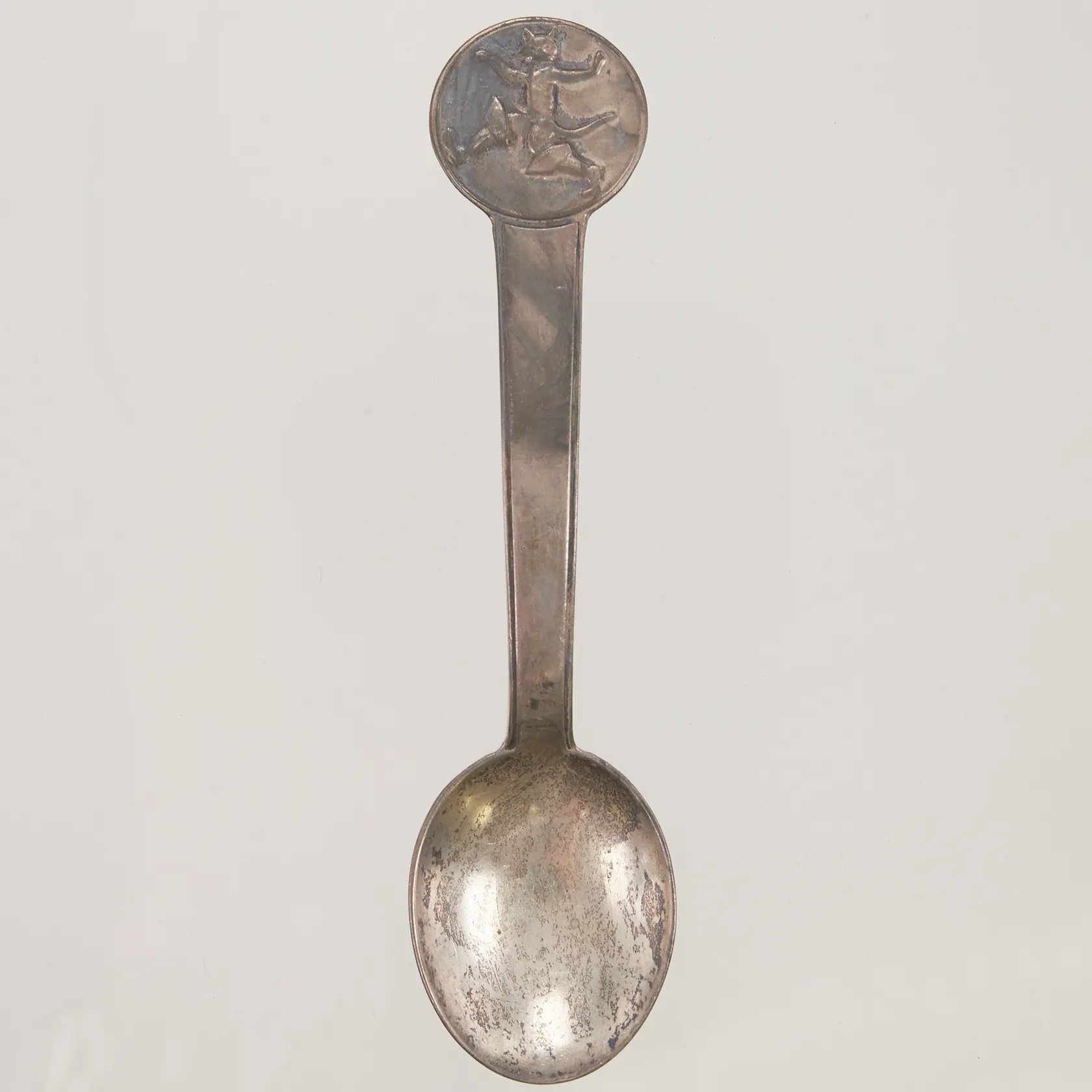 Sked, 13cm, dekor av katt med stövlar, 830/1000 Silver 28,0g. Vikt: 28 g.