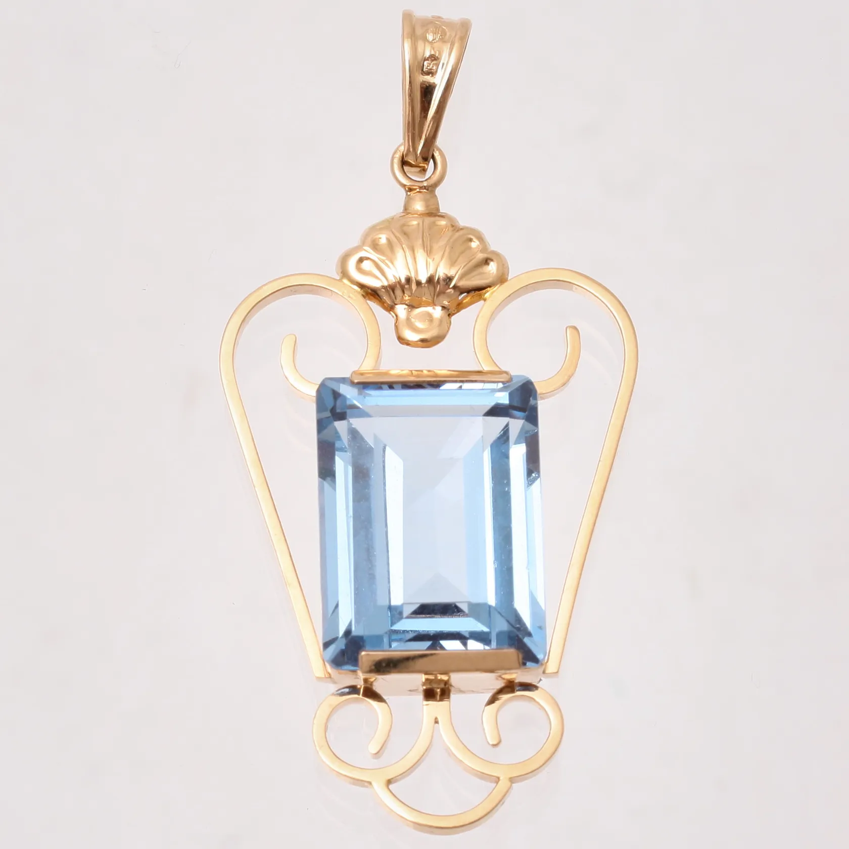 Hänge i 18K guld, mått 24,8x51,4mm, 1st blå sten, mått 13x17,9mm, bruttovikt 10,15g, ca nettovikt 6g. Vikt: 6 g.