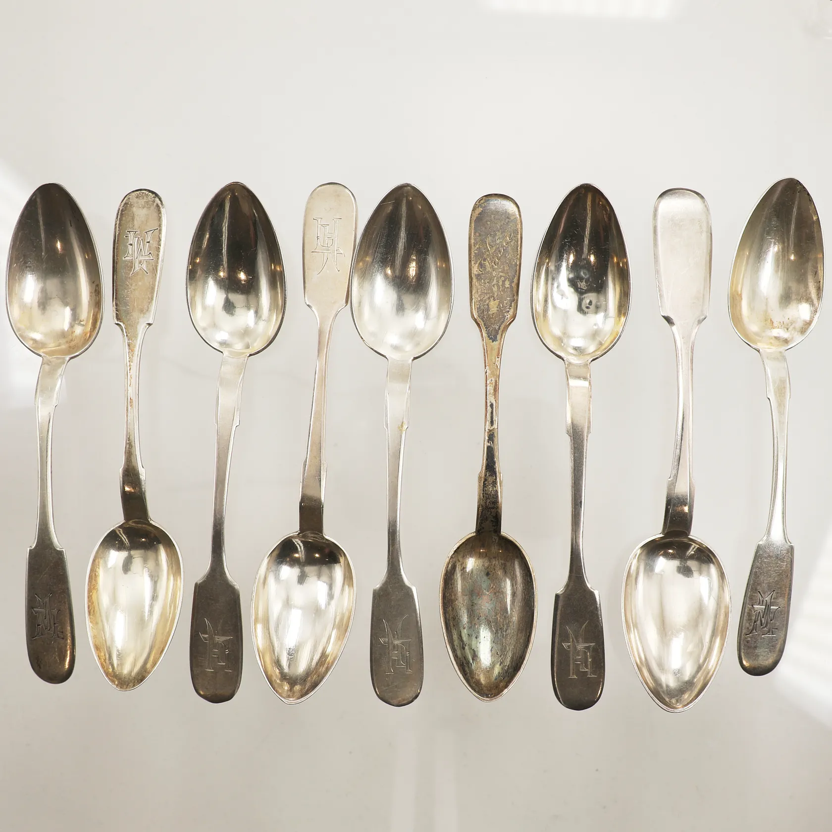 Nio skedar, längd 14cm, gravyr, silver Vikt: 173,8 g.