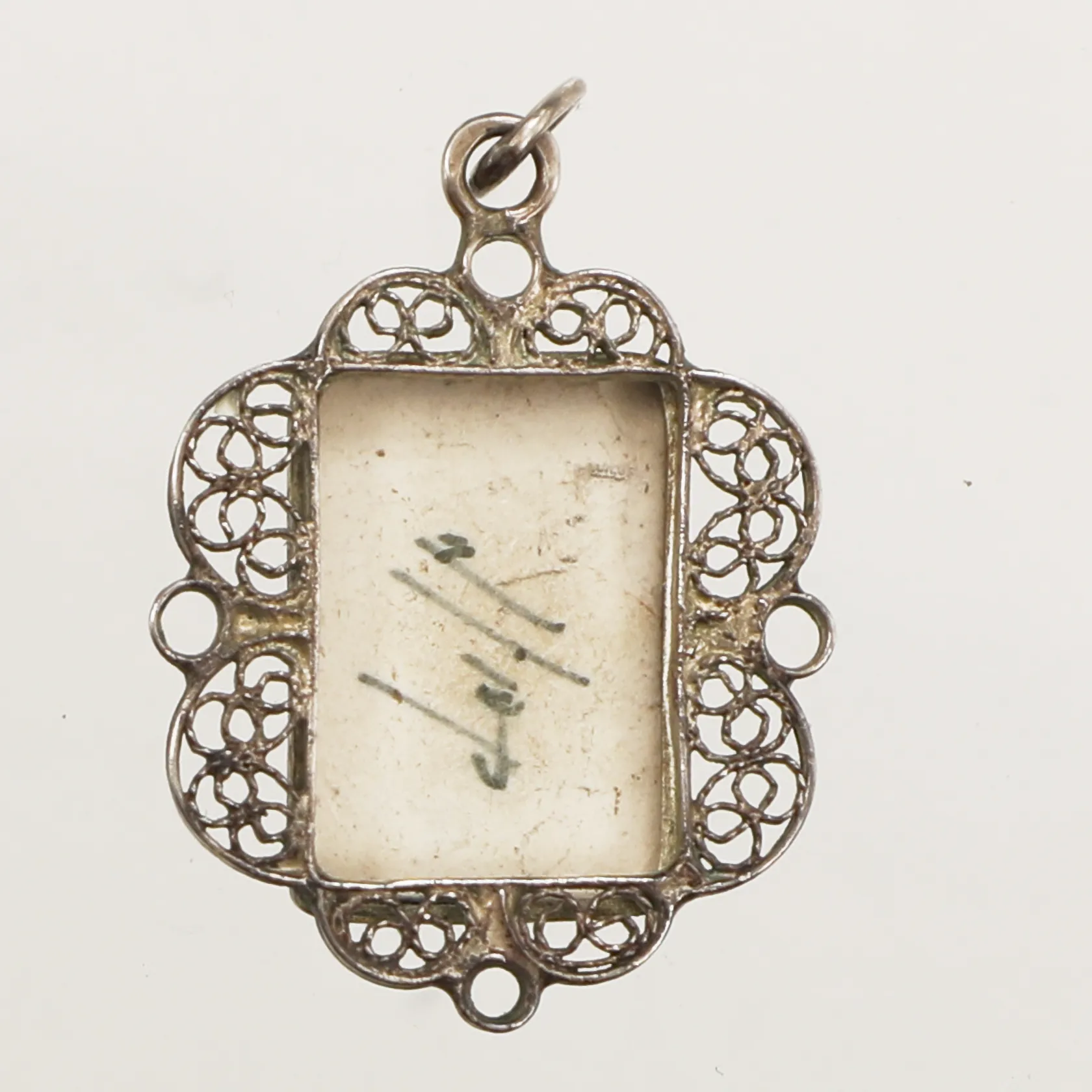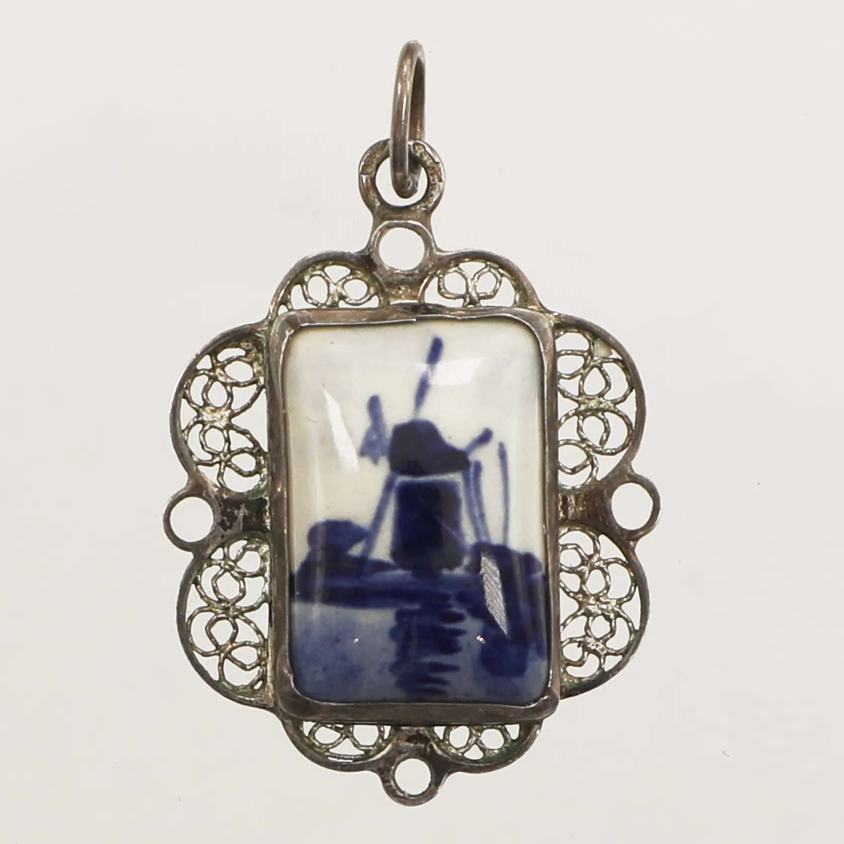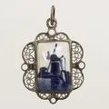Hänge med filigranarbete och porslin, längd 33mm inklusive ögla, bredd 21,5mm, 835/1000 silver Vikt: 3 g.