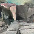 Tavla, Alvar Eliasson, "Rosa huset", olja på pannå, rammått 60x71cm, signerad AE 86, skador samt lättare färgbortfall på motiv, sliten ram, Skickas med postpaket.