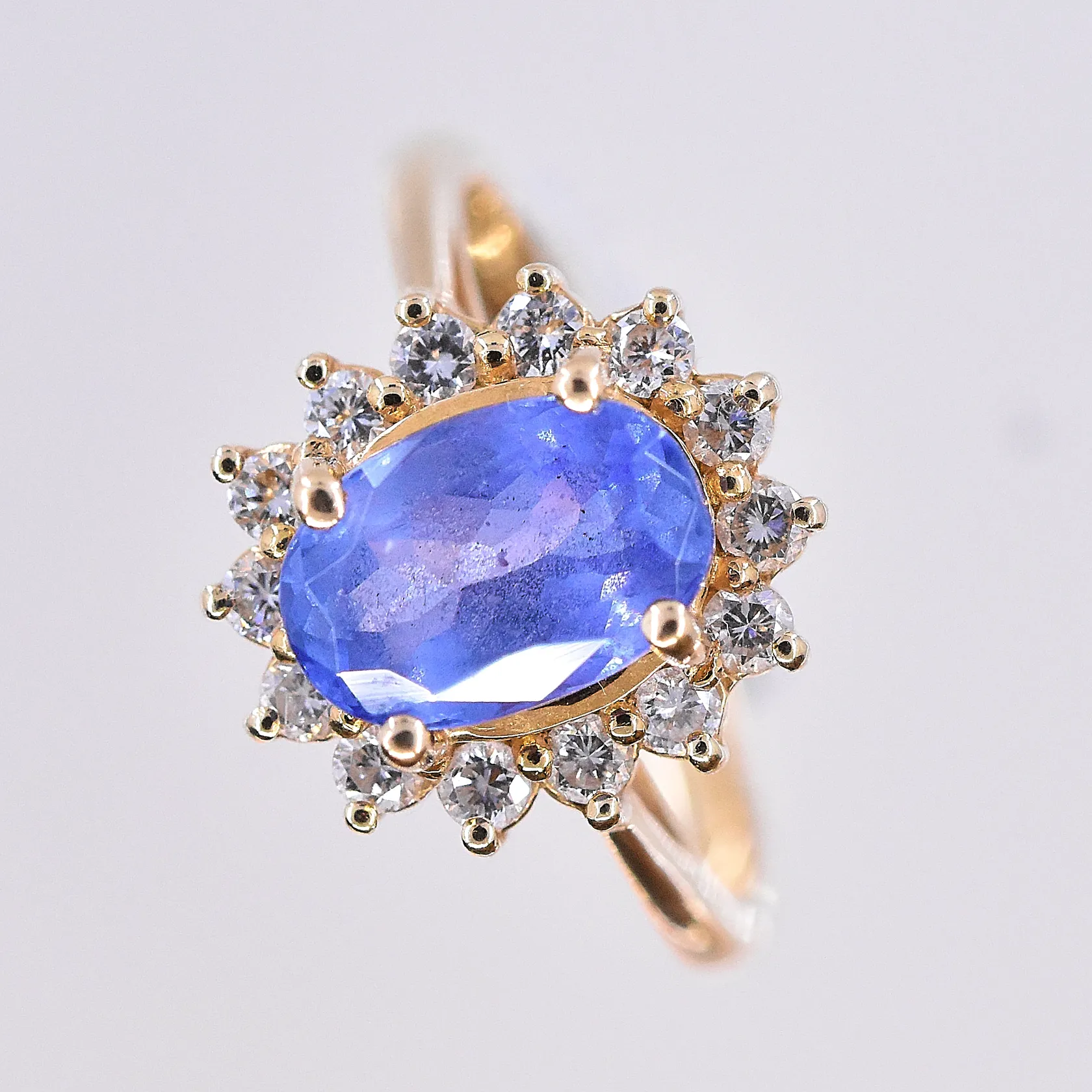 Finns för visning på Östermalm. Ring med Tanzanit ca 1,75ct samt diamanter ca 14x0,02ct, stl 17, bredd skena 2 mm, 18K. Vikt: 4,8 g.