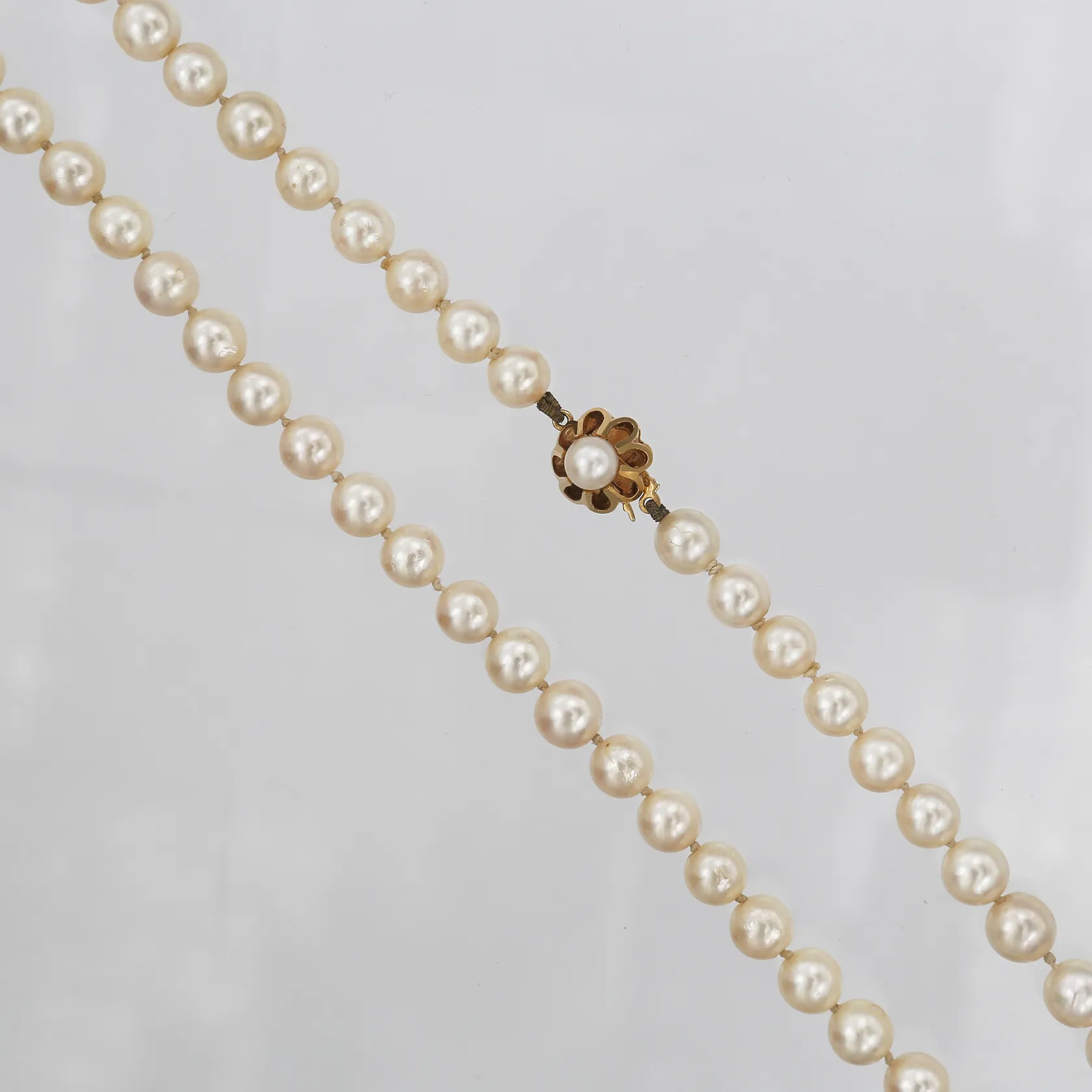 Pärlcollier med odlade saltvattenpärlor Akoya, längd: 43 cm, Ø ca 7 - 8 mm, lås i 18K guld. Finns för visning på Pantbanken Skärholmen