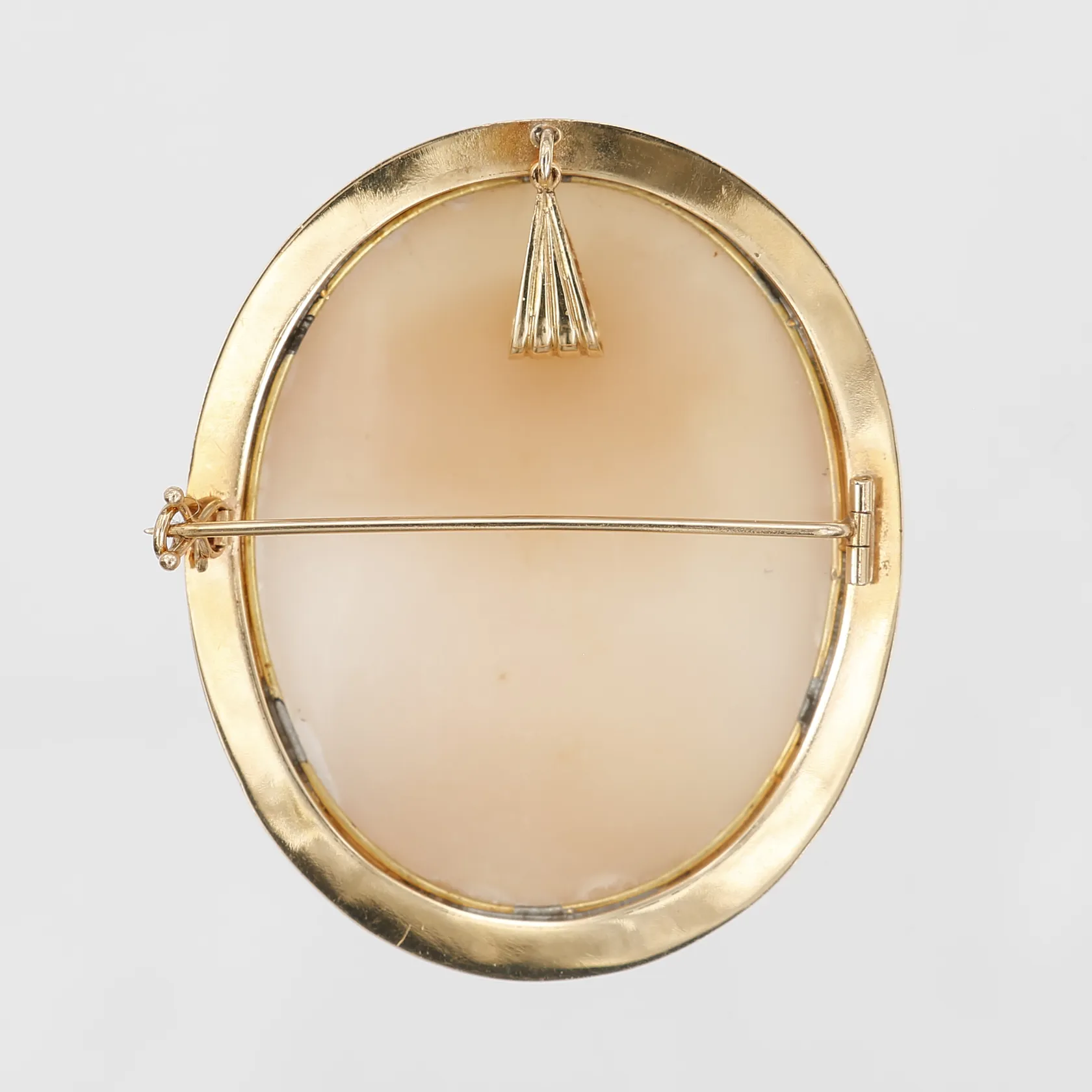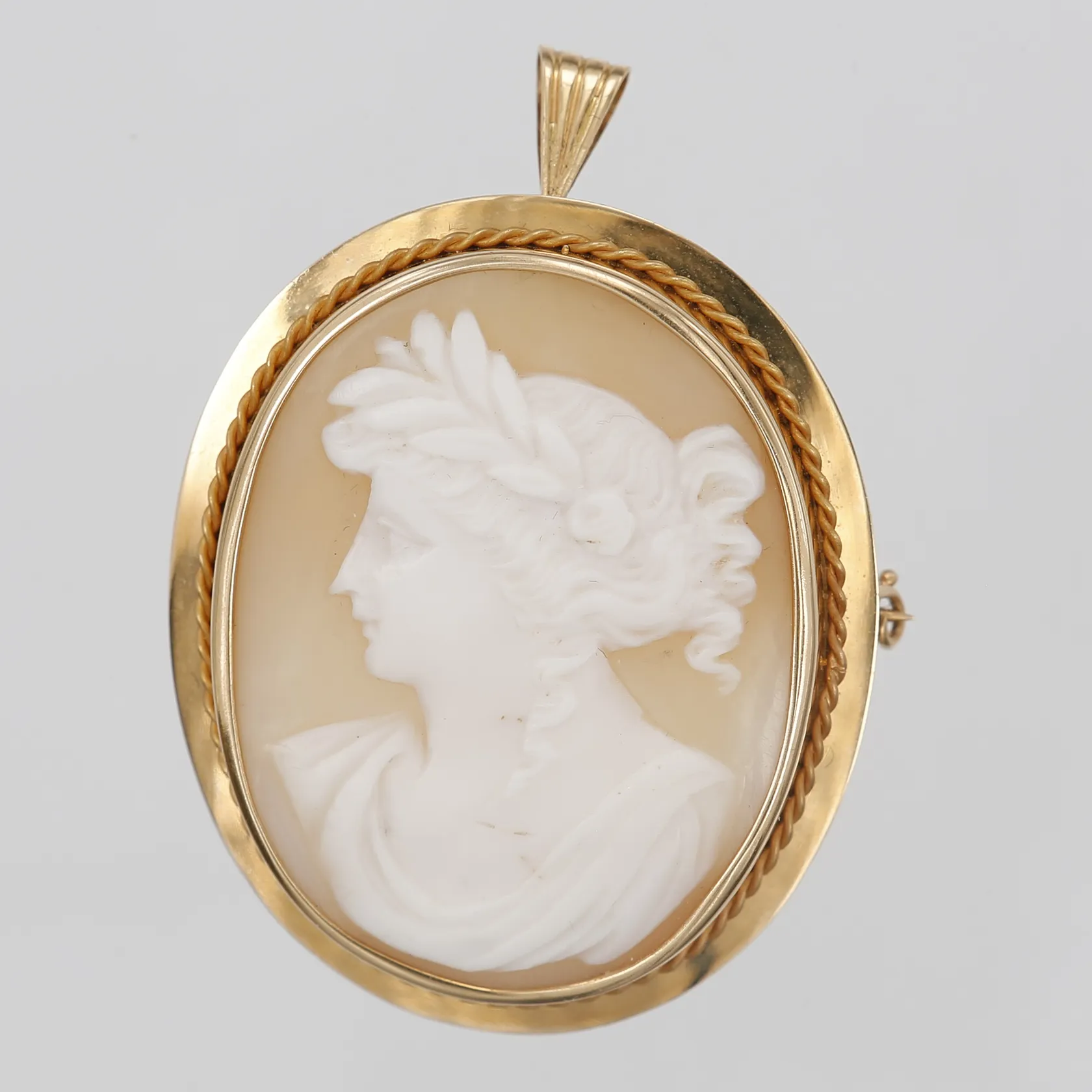 Brosch/Hänge med kamé, höjd: 47 mm, bredd: 40 mm, 18K guld. Bruttovikt: 14,5g Finns för visning på Pantbanken Skärholmen