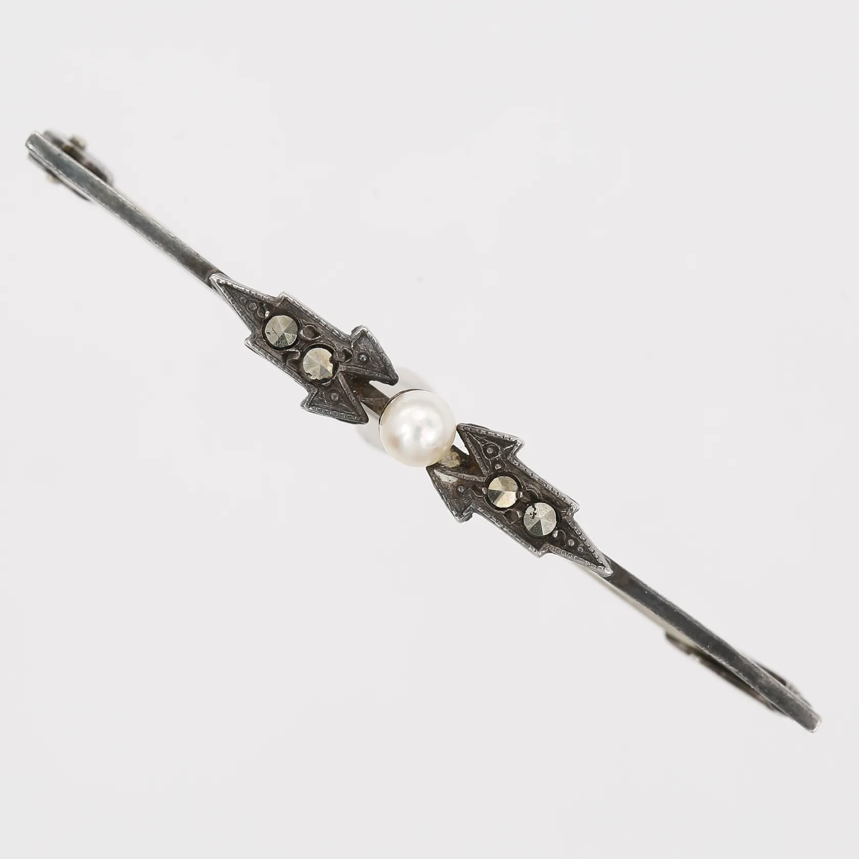 Brosch med pärla samt markasiter, längd: 4,5 cm, bredd: 2-4 mm, nål i vitmetall, silver. Finns för visning på Pantbanken Skärholmen Vikt: 1,7 g.