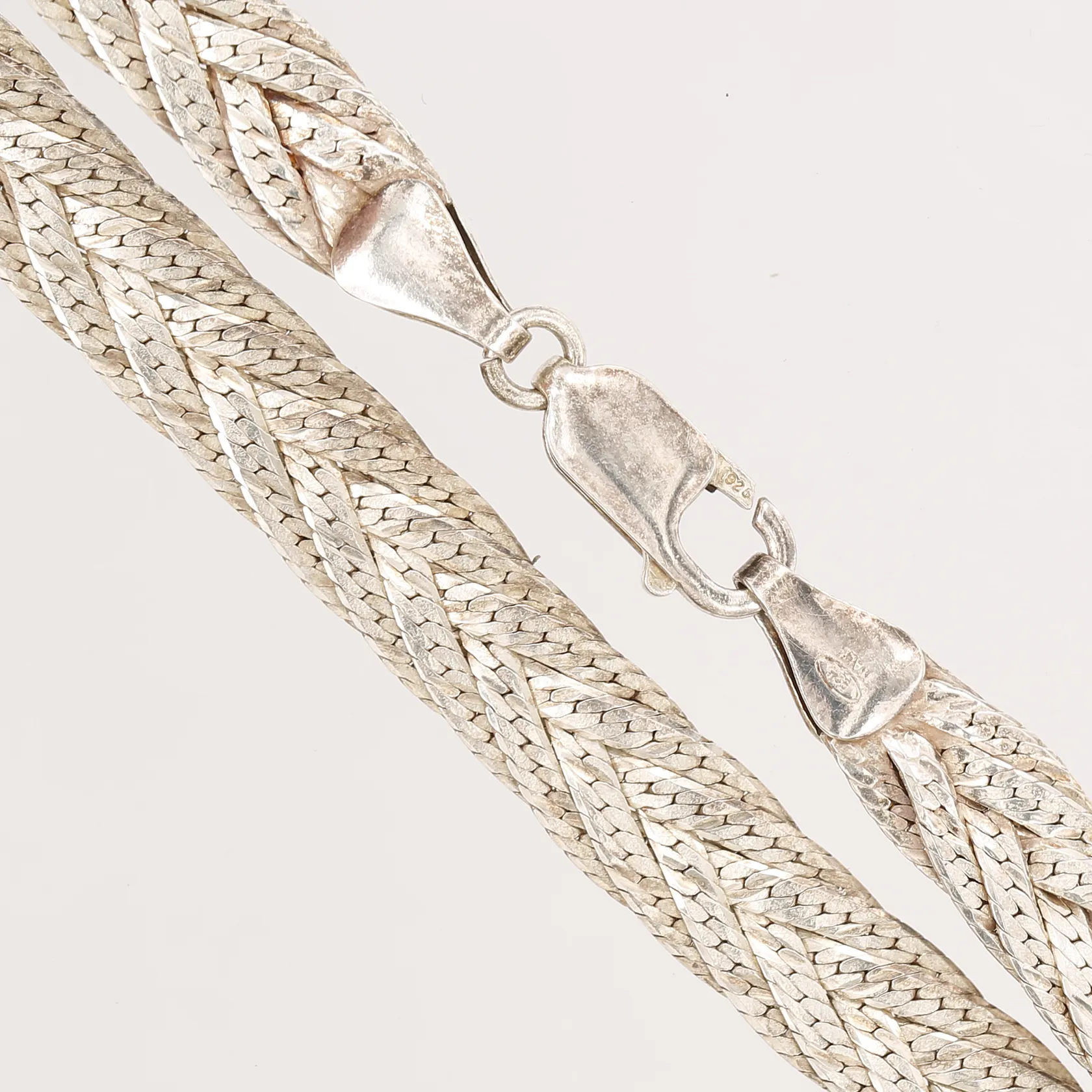Collier, flätad länk, längd 42cm, bredd 8mm, 925/1000 silver. Finns för visning på Pantbanken Skärholmen Vikt: 21,7 g.