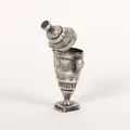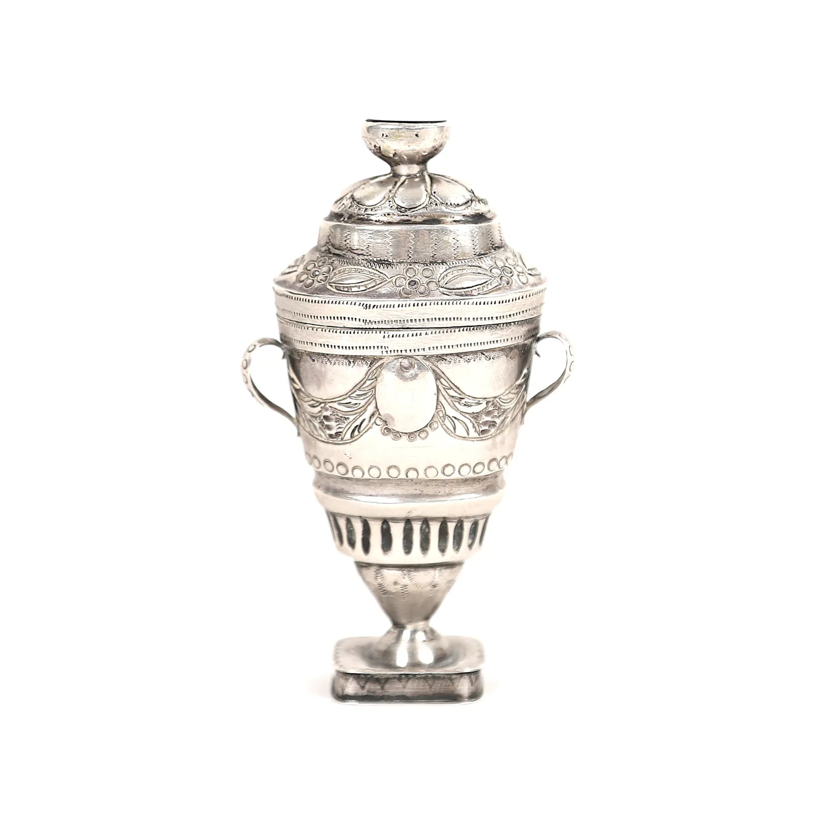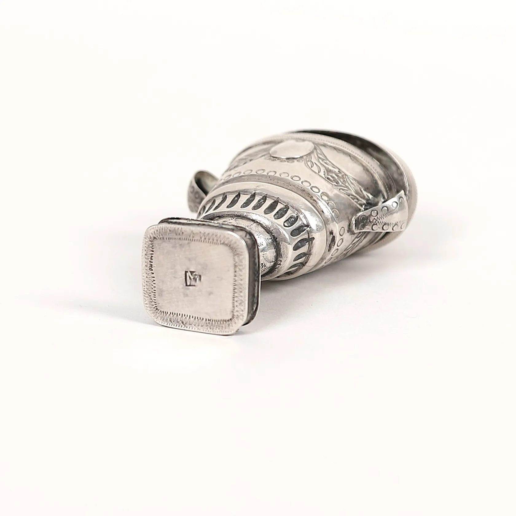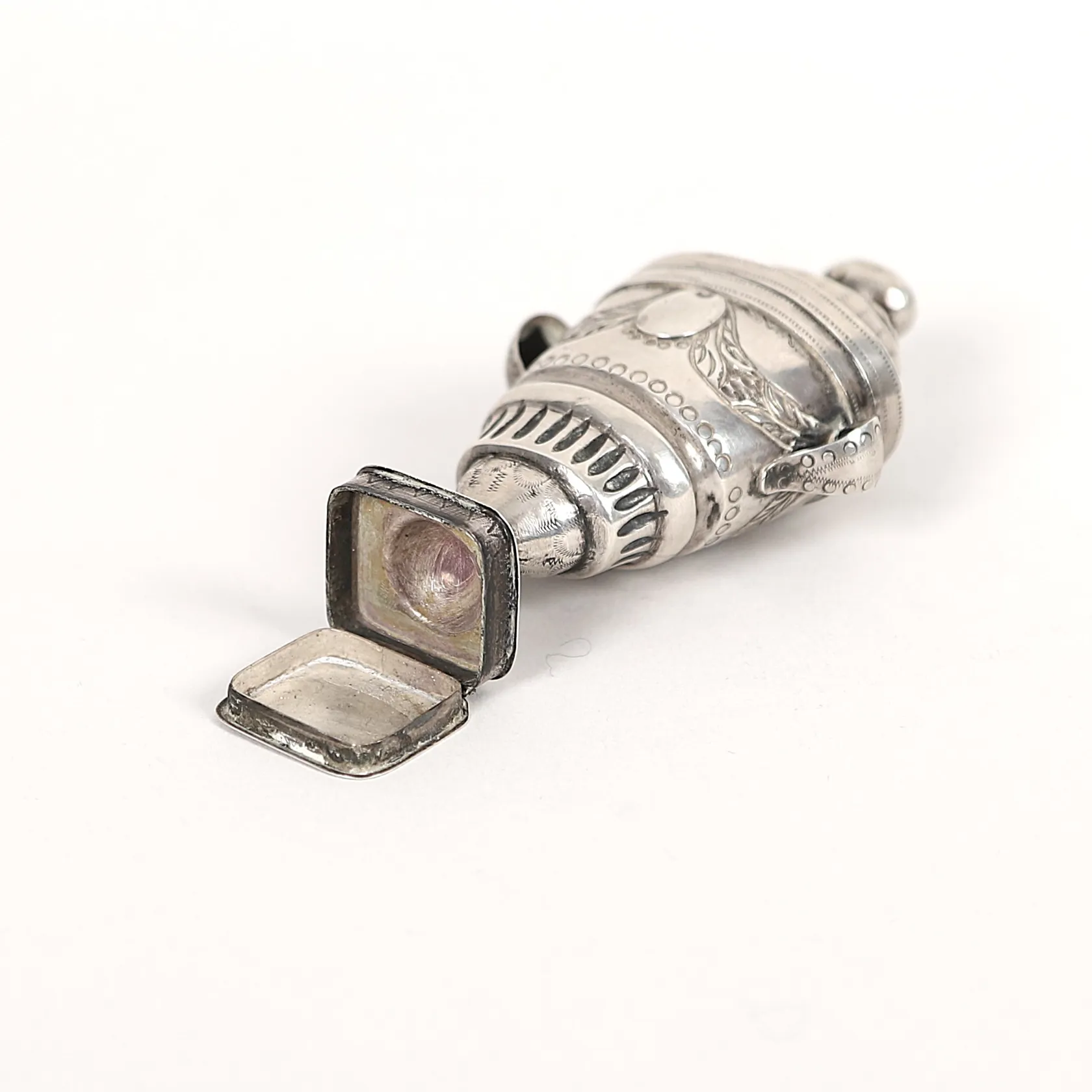Luktdosa med onyx, nyklassicism, omkring år 1800, troligen Danmark, gångjärnsförsett lock, rik dekor av bland annat festånger med kartuscher, rektangulär fotplatta med gömma, höjd 9cm, åldersbetingad slitage, fot med lagning/förstärkning. Vikt: 30,6 g.