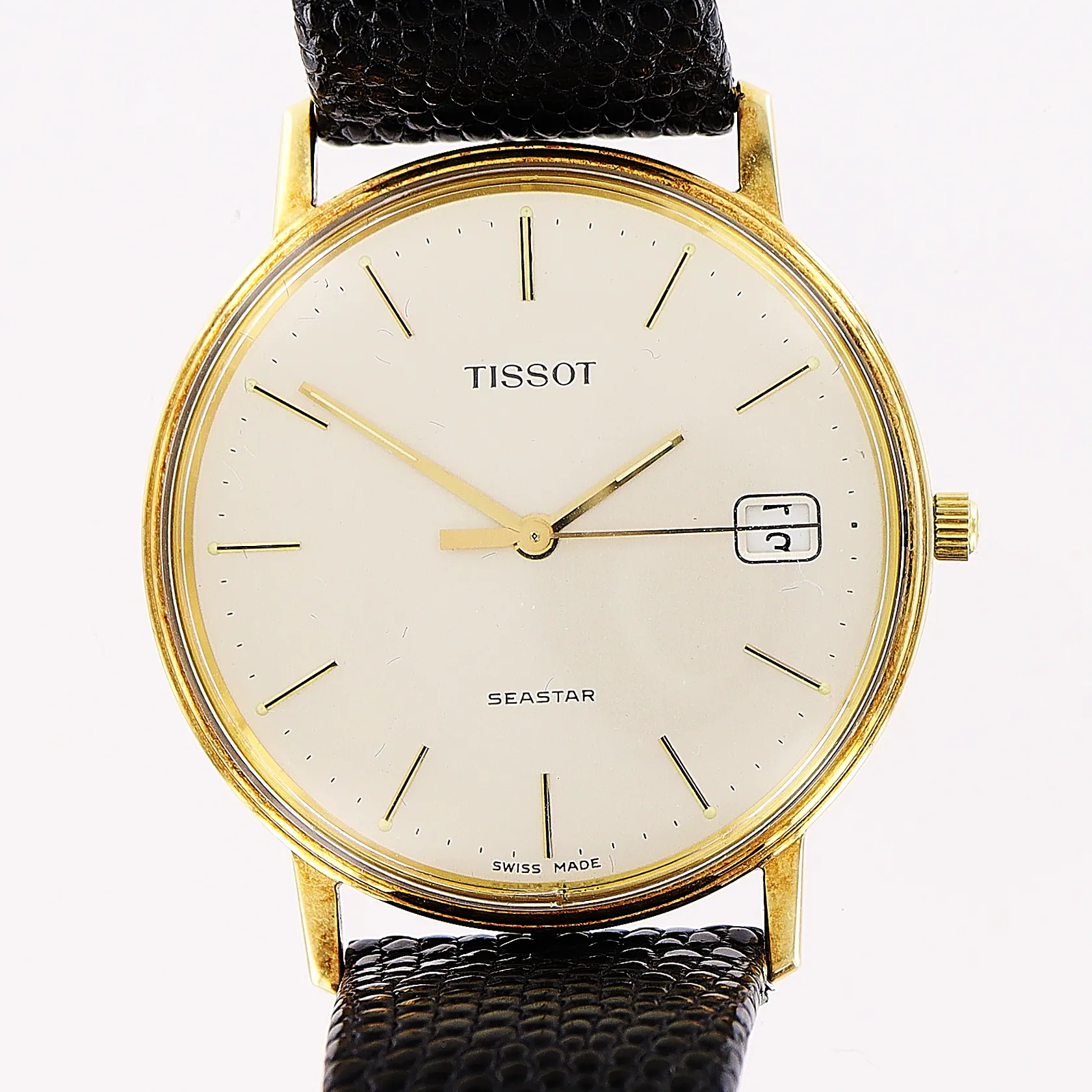 Herrur Tissot Seastar, 14K, quartz, Ø34mm,vit urtavla, datum, original läderband 23cm, i behov av service, bruttovikt 29g, box.