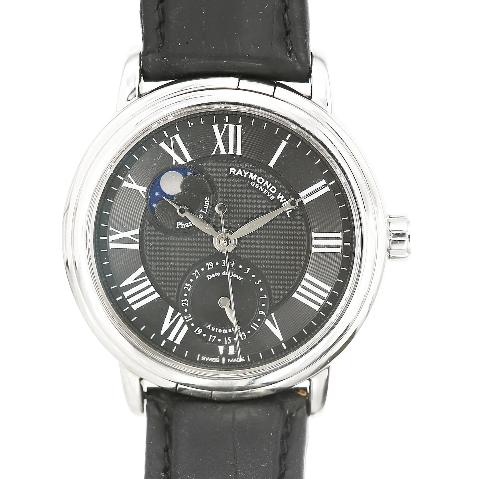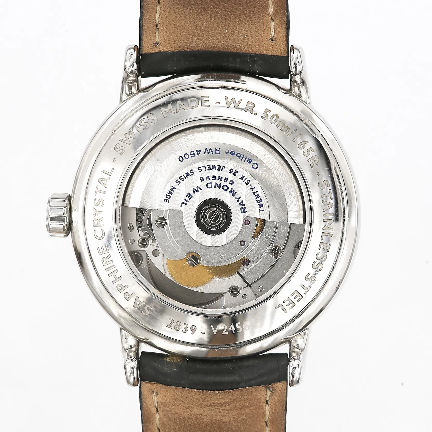 Herrur Raymond Weil, automatisk, stål, referensnummer 2839, serienummer V245641, caliber RW4500, Ø42mm, glasad bakboett, safirglas, läderarmband, inga övriga tillbehör, slitage, repor. Finns för visning på Pantbanken Skärholmen