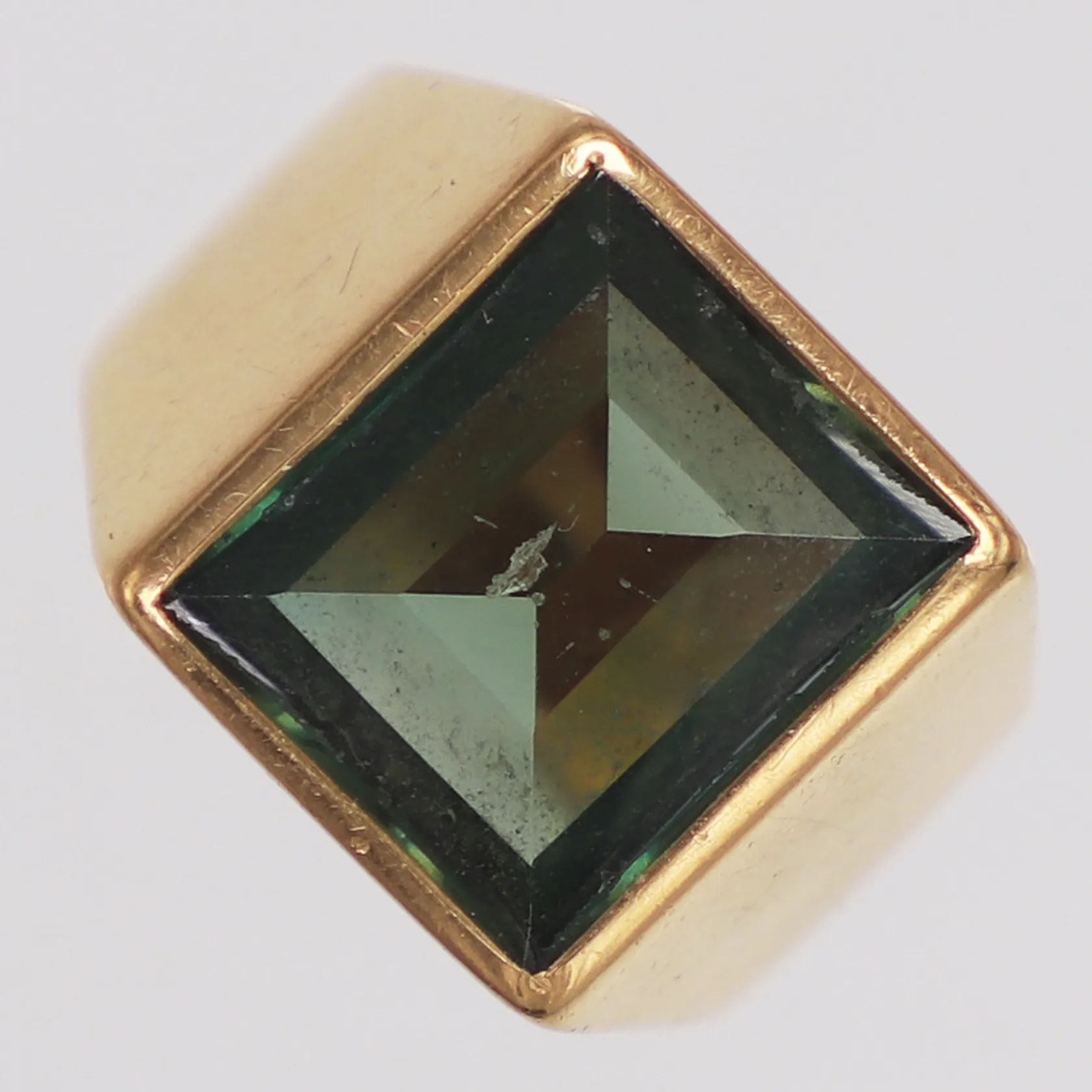Klackring grön sten, Ge-Kå-Smyckek G Kaplan år 1966, stl 19, bredd 6-15mm, nagg på sten, 18K Vikt: 10,3 g.