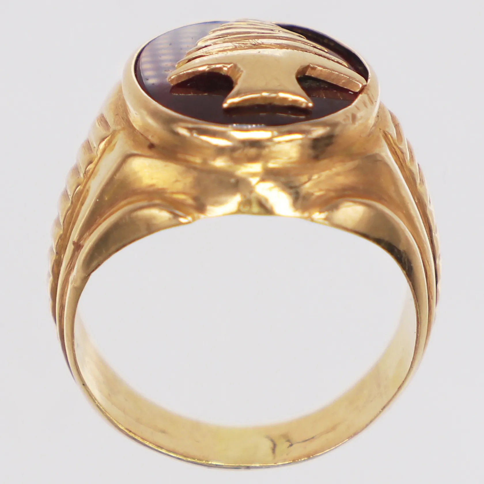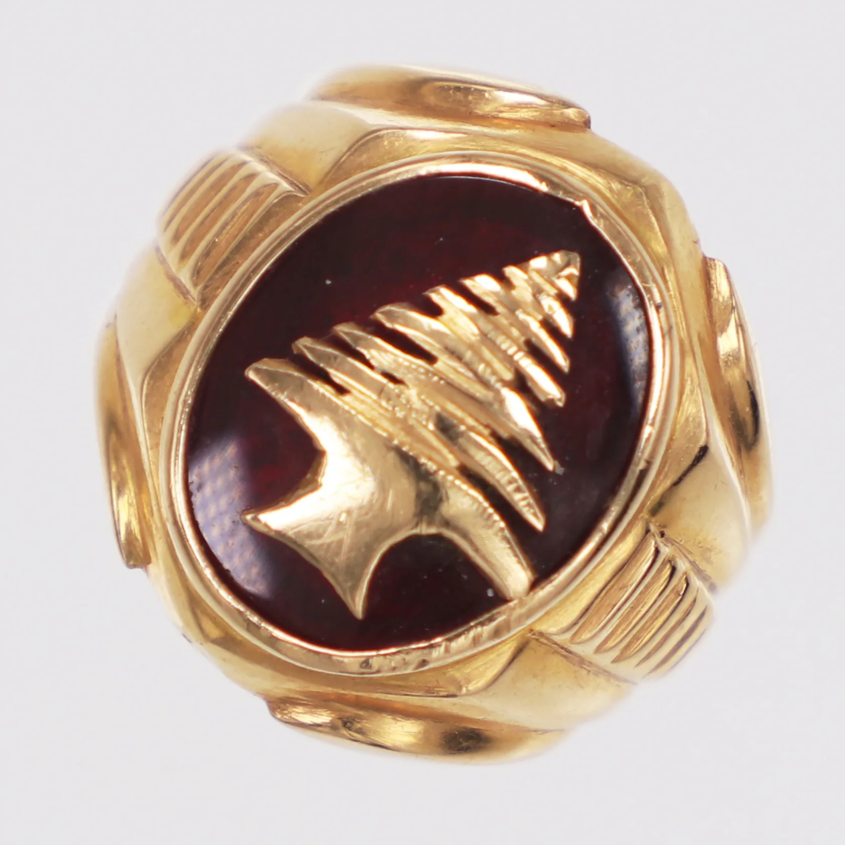Klackring cederträd, röd sten, stl 17½, bredd 6-20mm, 18K Vikt: 8 g.