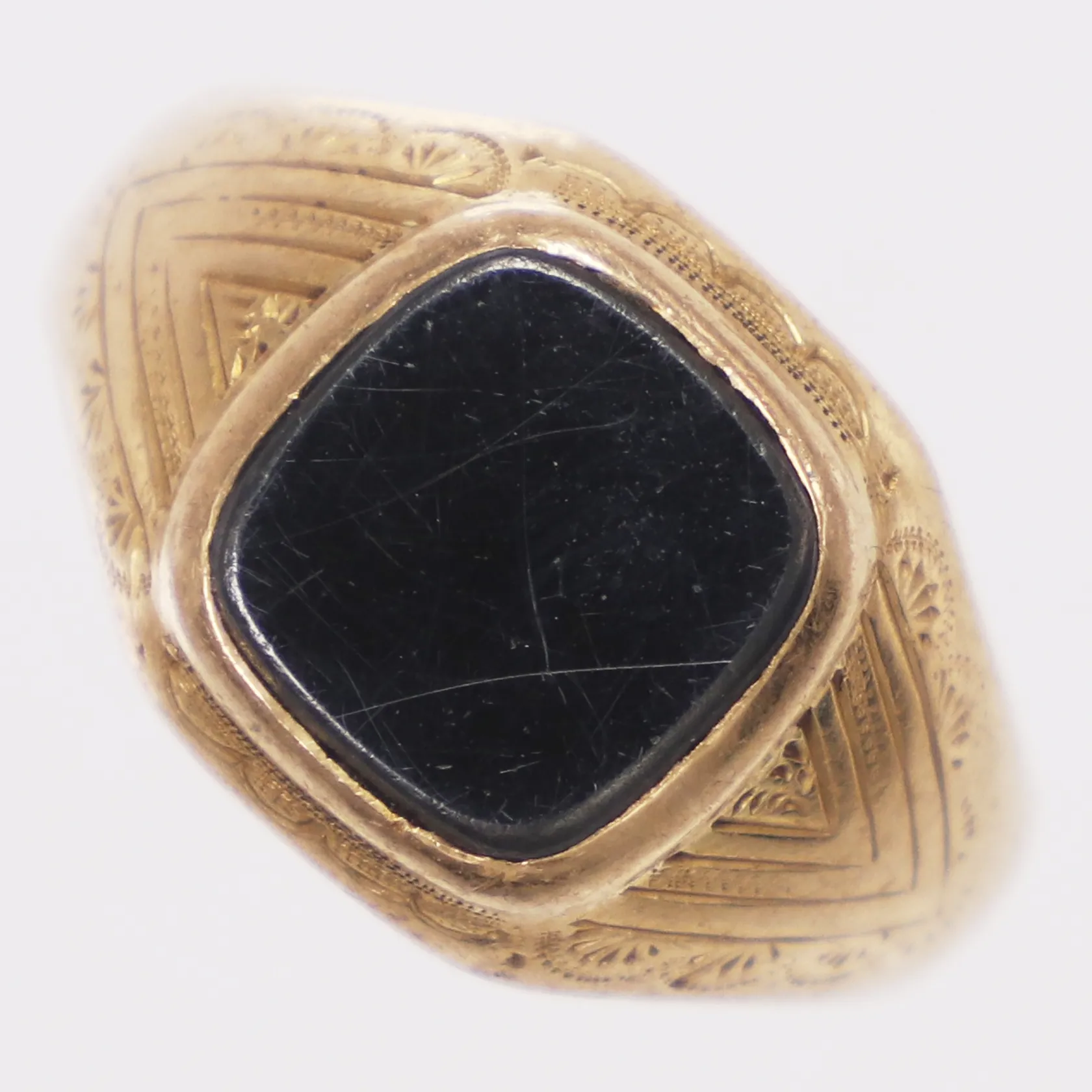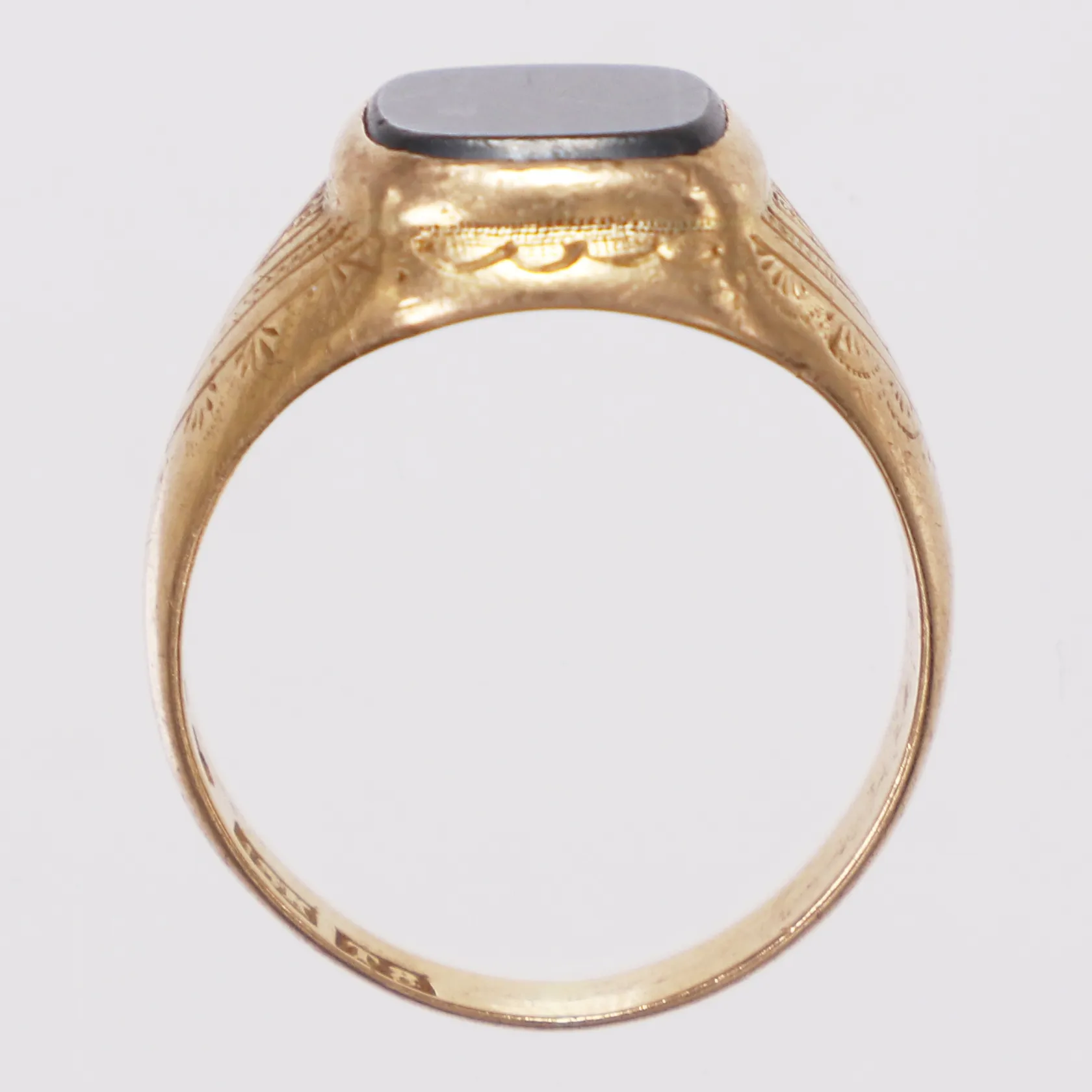 Ring troligen hematit, stl 18, bredd 3,5-12,5mm, Michelsson Guldsmed H, 1945, repig sten, 18K Vikt: 9,1 g.