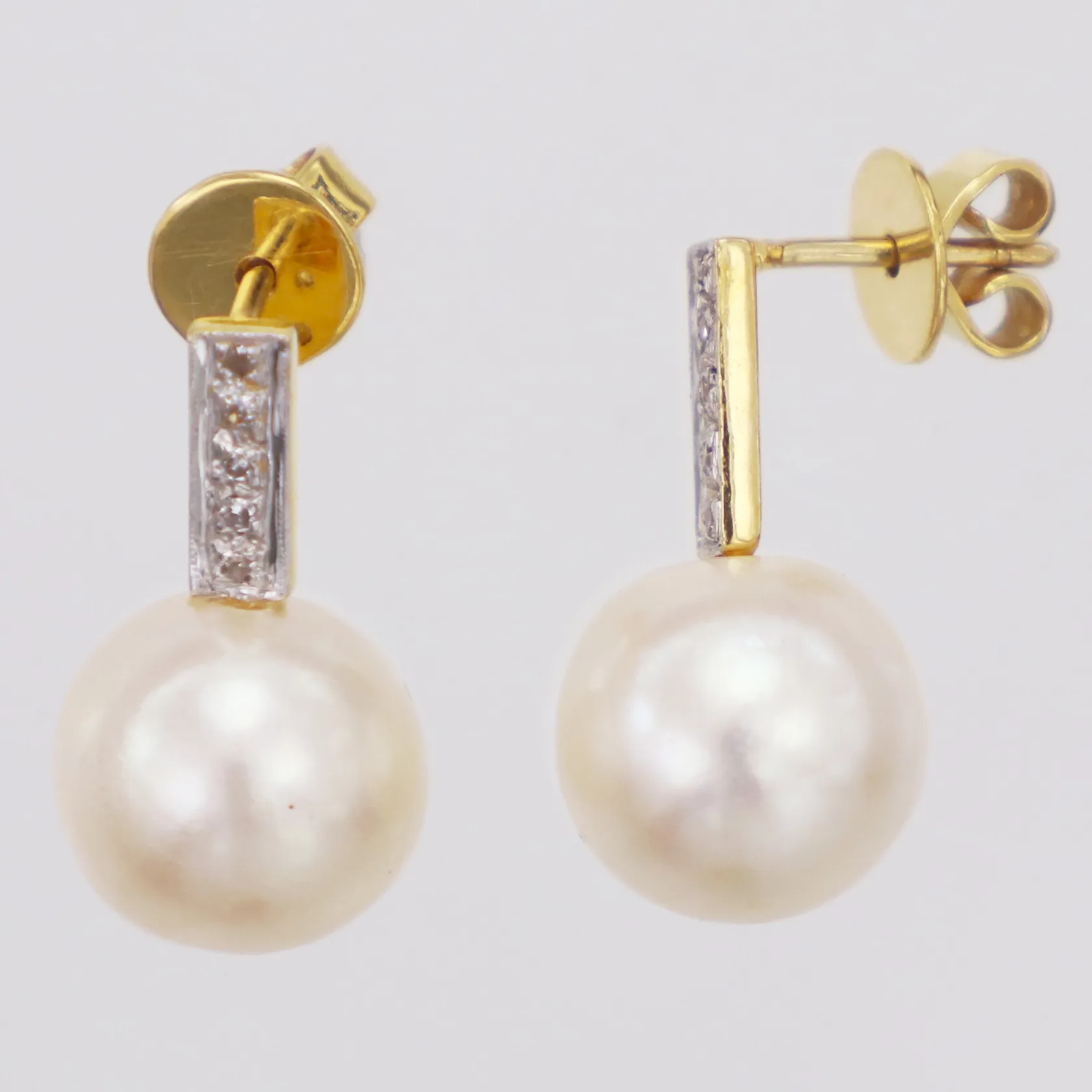 Ett par örhängen odlade sötvattenpärlor Ø11mm, & diamanter ca 0,05ctv, 20mm, 21K Vikt: 6 g.