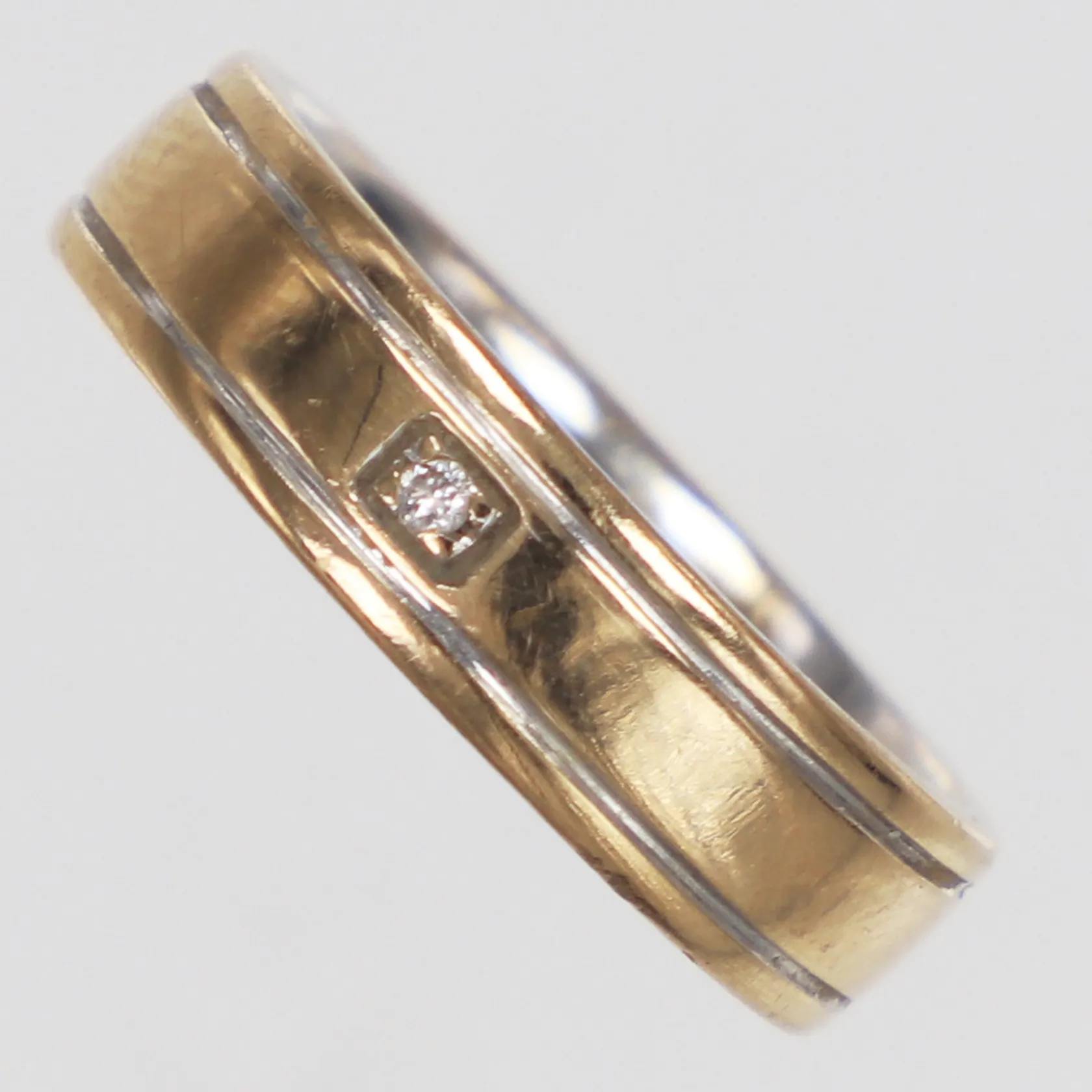 Ring diamant ca 0,01ct, stl 16¼, bredd 4,8mm, gulguld på utsidan, vitguld på insidan, gravyr, 18K Vikt: 6 g.