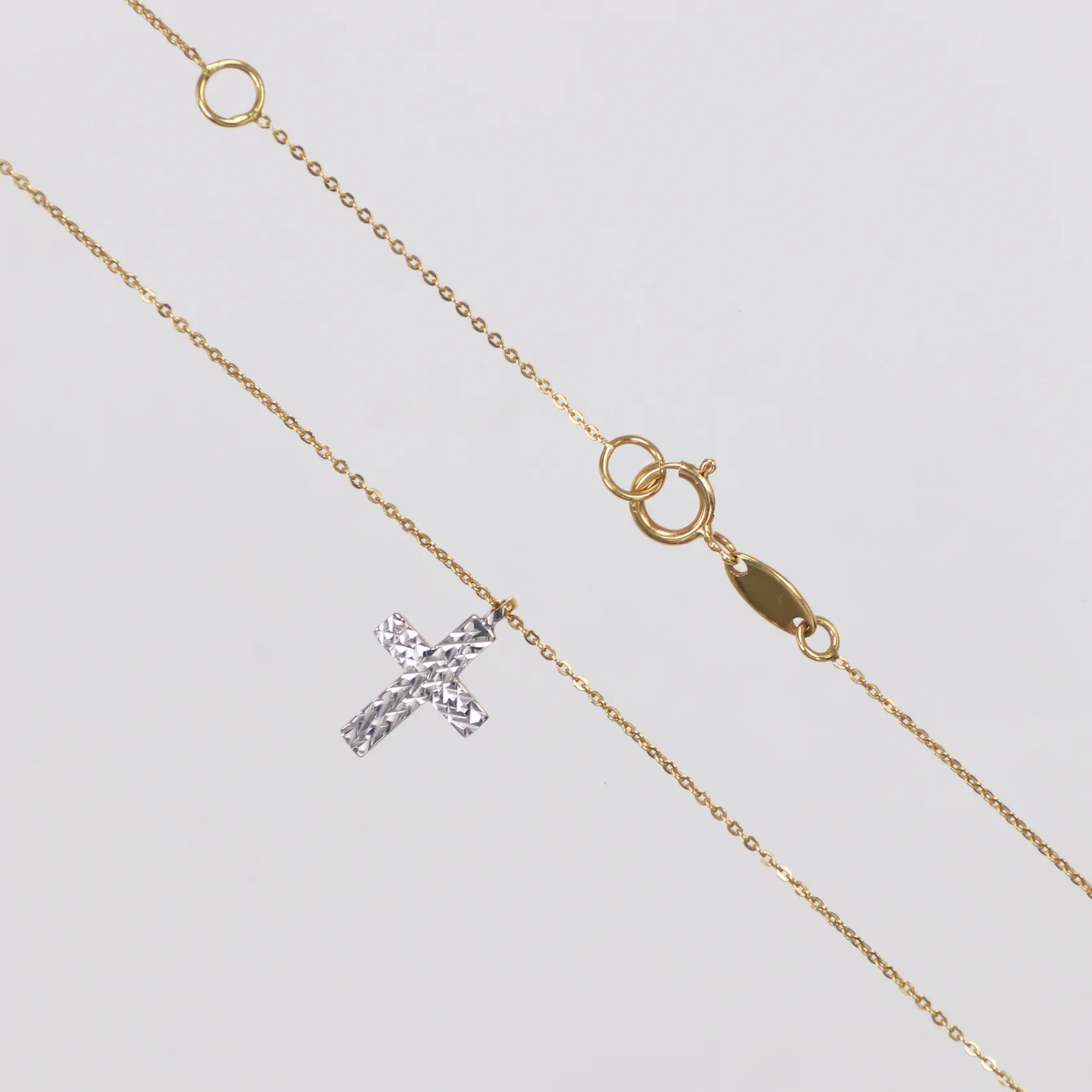 Collier integrerat hänge kors i vitguld, Guldfynd, 42/45cm, bredd 0,4mm, klämd länk,18K Vikt: 1,4 g.