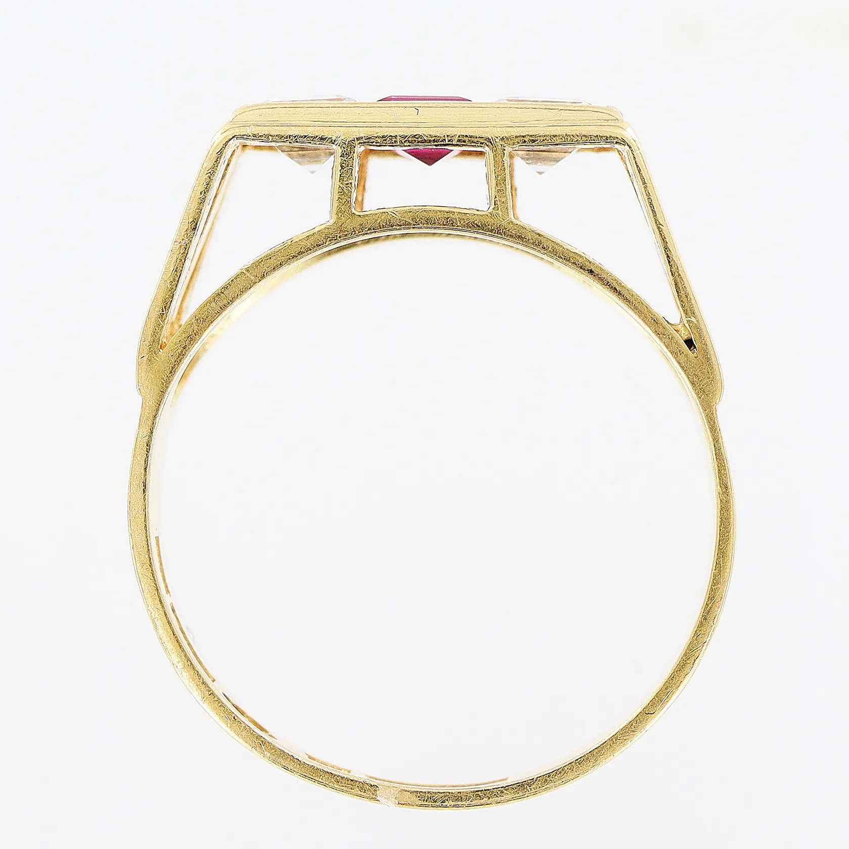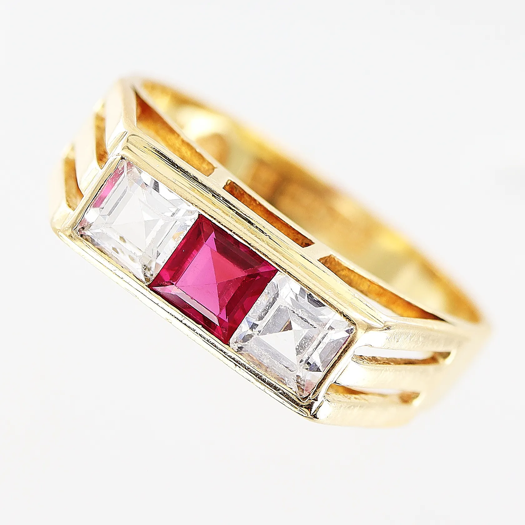 Ring, röd och vita stenar, stl 18¼, bredd 3-5,5mm, höjd från skenan 4,5mm, Guldvaruaktiebolaget G. Dahlgren & Co Ab, Malmö år 1959, 18K Vikt: 3,8 g.
