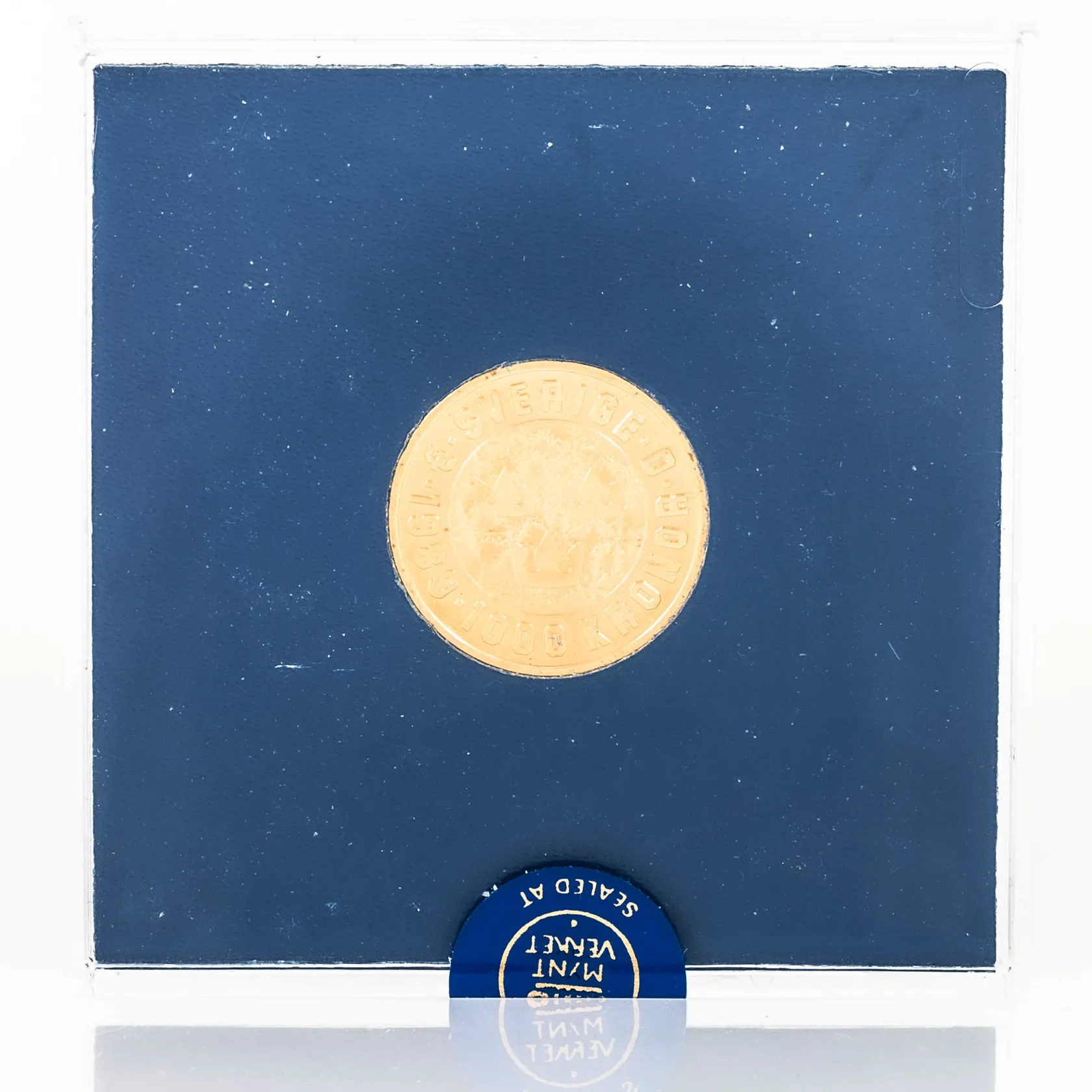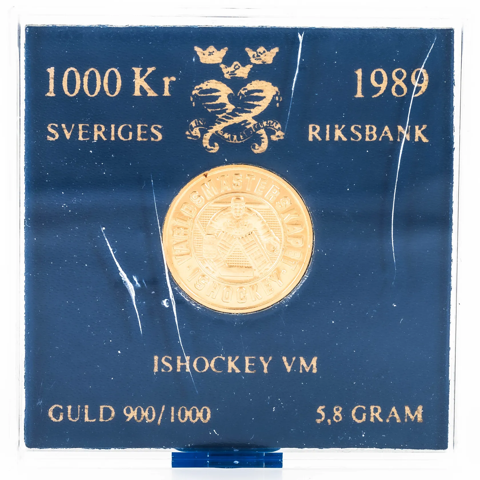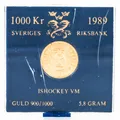 Minnesmynt "ISHOCKEY VM 1989". Ø 20 mm. Nominellt värde 1000kr. 5,8g 21,6K. Plastetui med repor / sprickor. Vikt: 5,8 g.