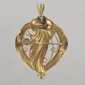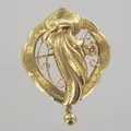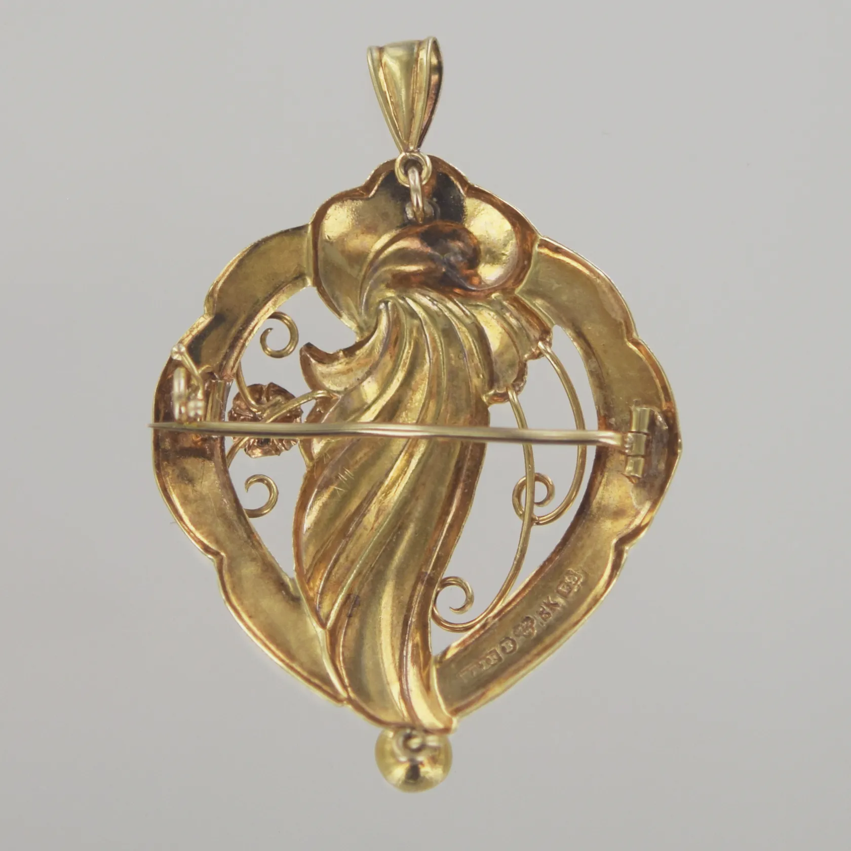 Hänge/brosch, längd 5 cm, bredd 3 cm, ojämn nål,18K Vikt: 3,7 g.