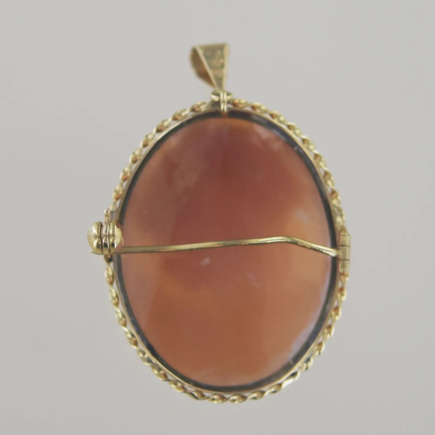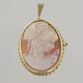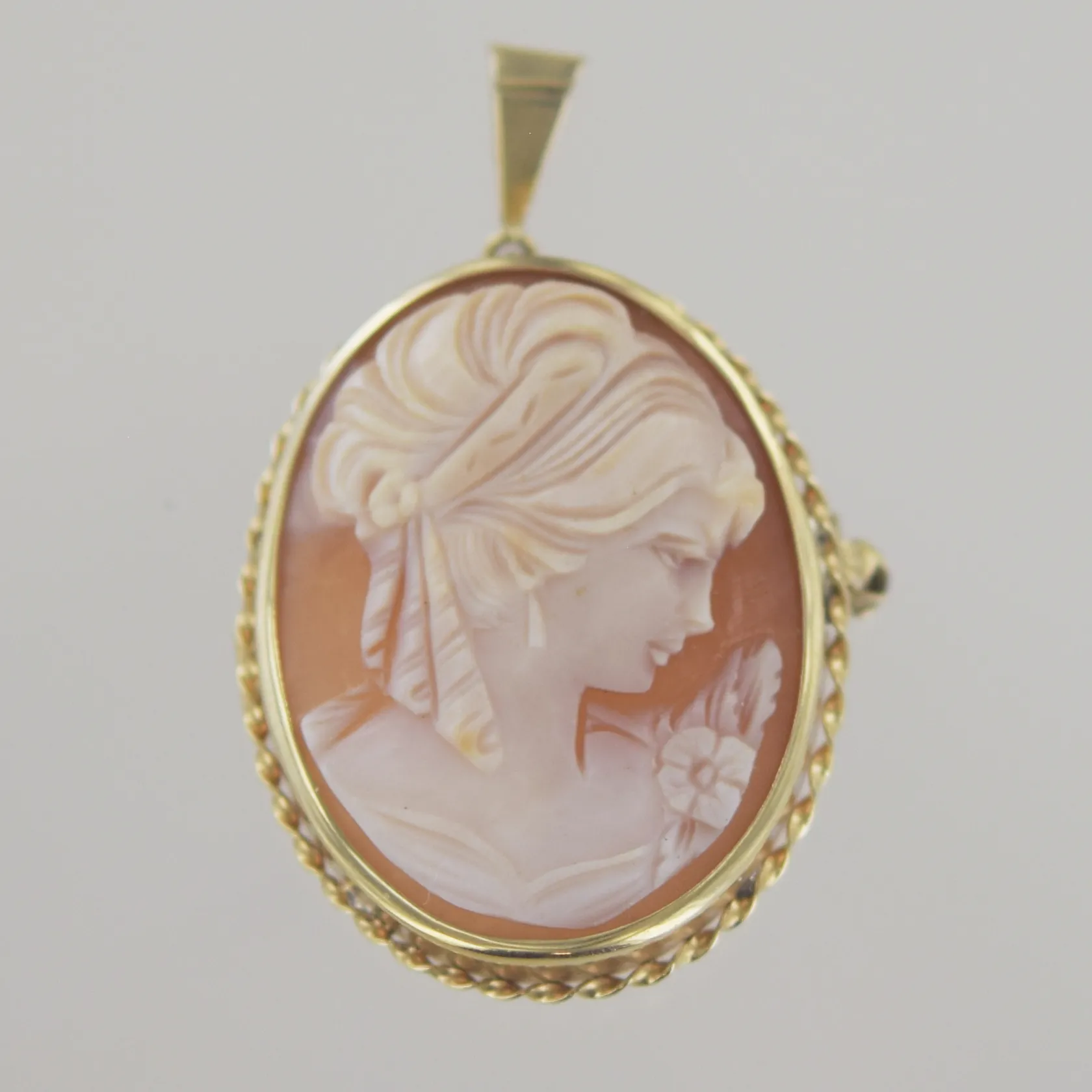 Hänge/brosch camé, höjd 4 cm, bredd 2,5 cm, ojämn nål, 18K Vikt: 6,3 g.