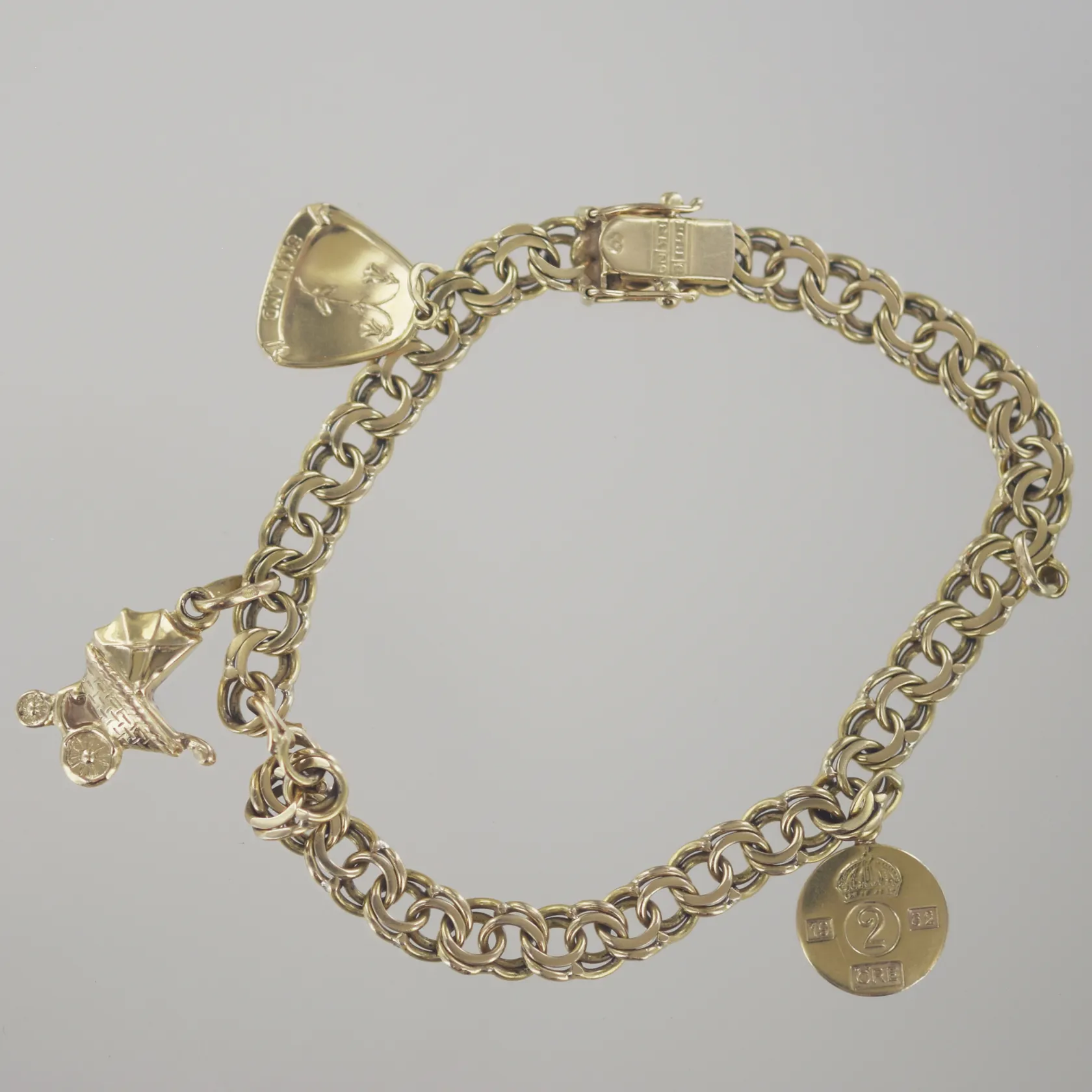 Armband bismark med berlocker, längd 19 cm, bredd 5,6 mm, 18K Vikt: 16,6 g.
