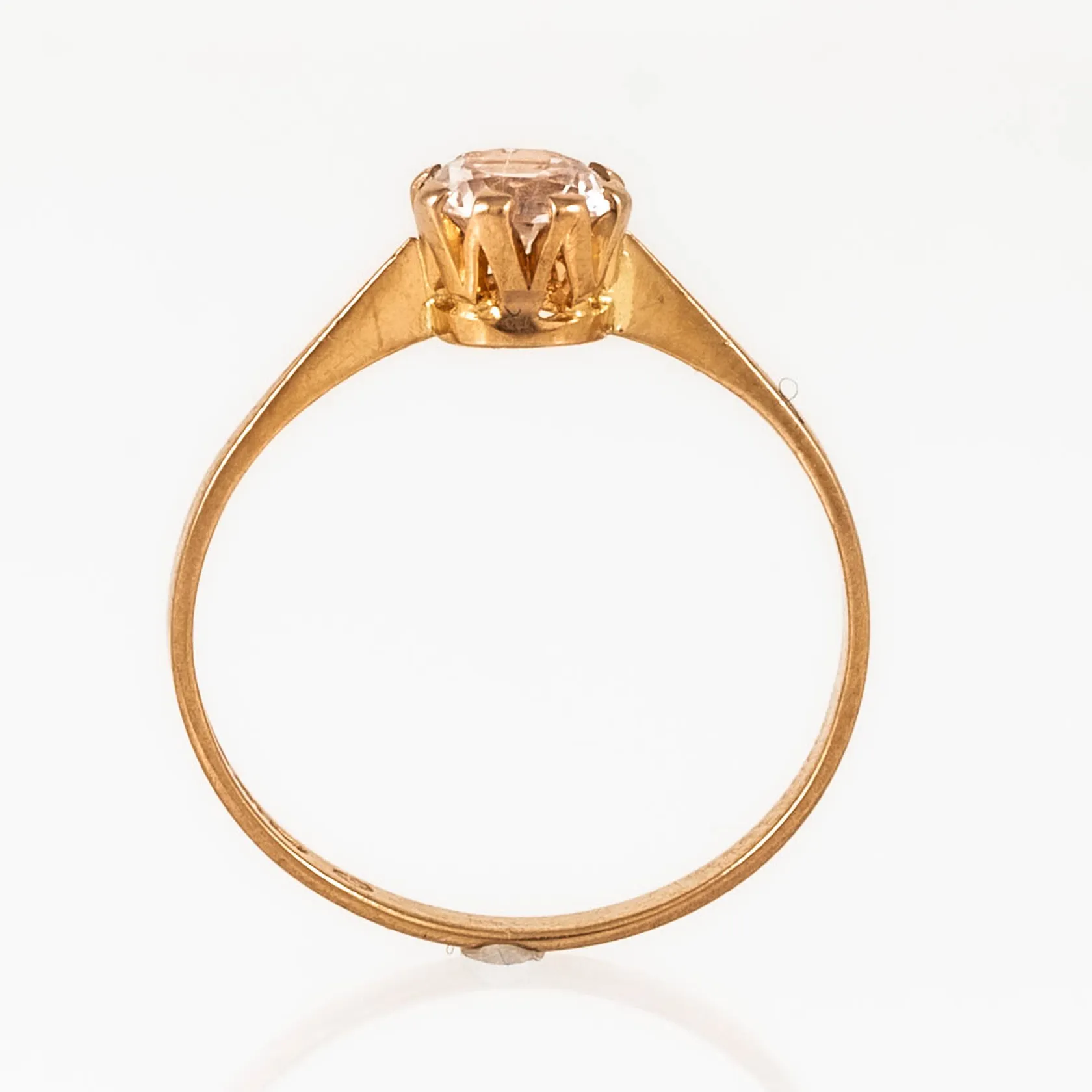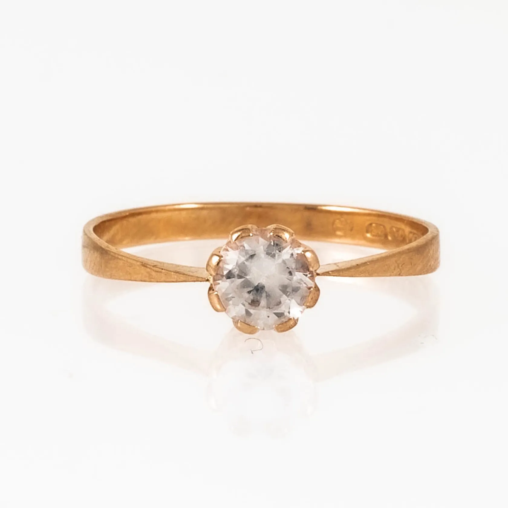 Ring i 18K guld med en vit sten (lite nött). Den är i storlek 17, är 2 - 5,5 mm bred och väger 1,5g. Finska stämplar från 1984 & svensk kontrollstämpel. Vikt: 1,5 g.