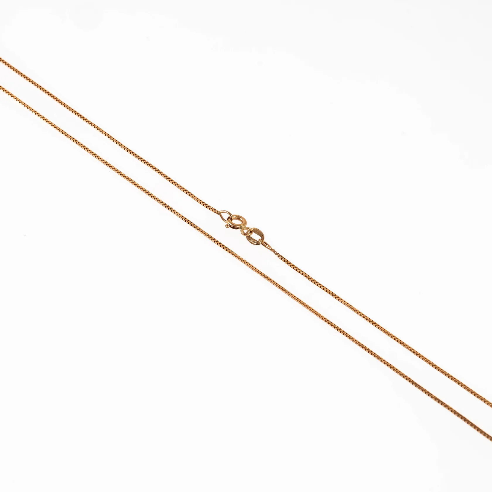 Kedja venezia i 18K guld. Den är 42 cm lång, 1 mm bred och väger 2,4g. Springring. Stämplad SCO (Svedbom o Co) 750. Fint skick. Vikt: 2,4 g.