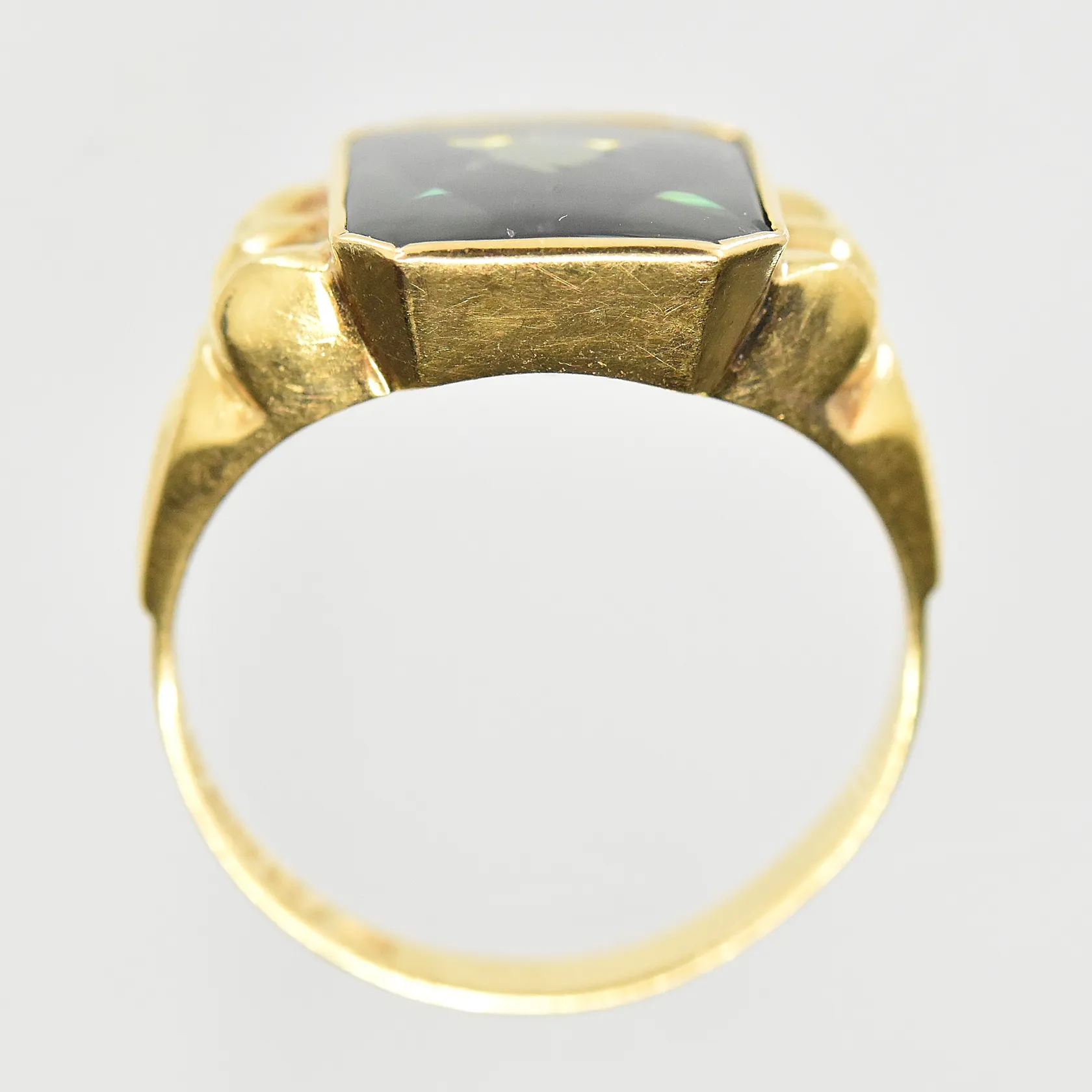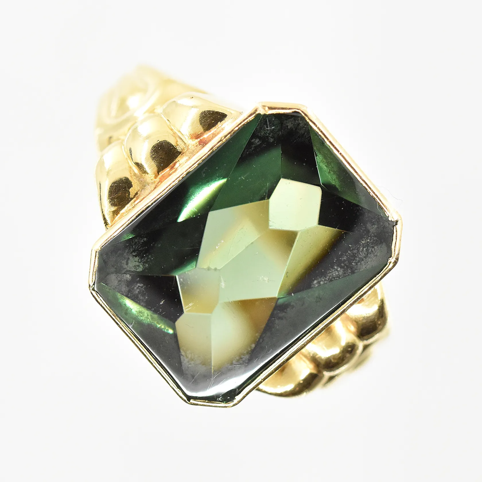 Klackring med grön sten, stl 19¾, bredd 3-16 mm, 18K. Vikt: 5,9 g.