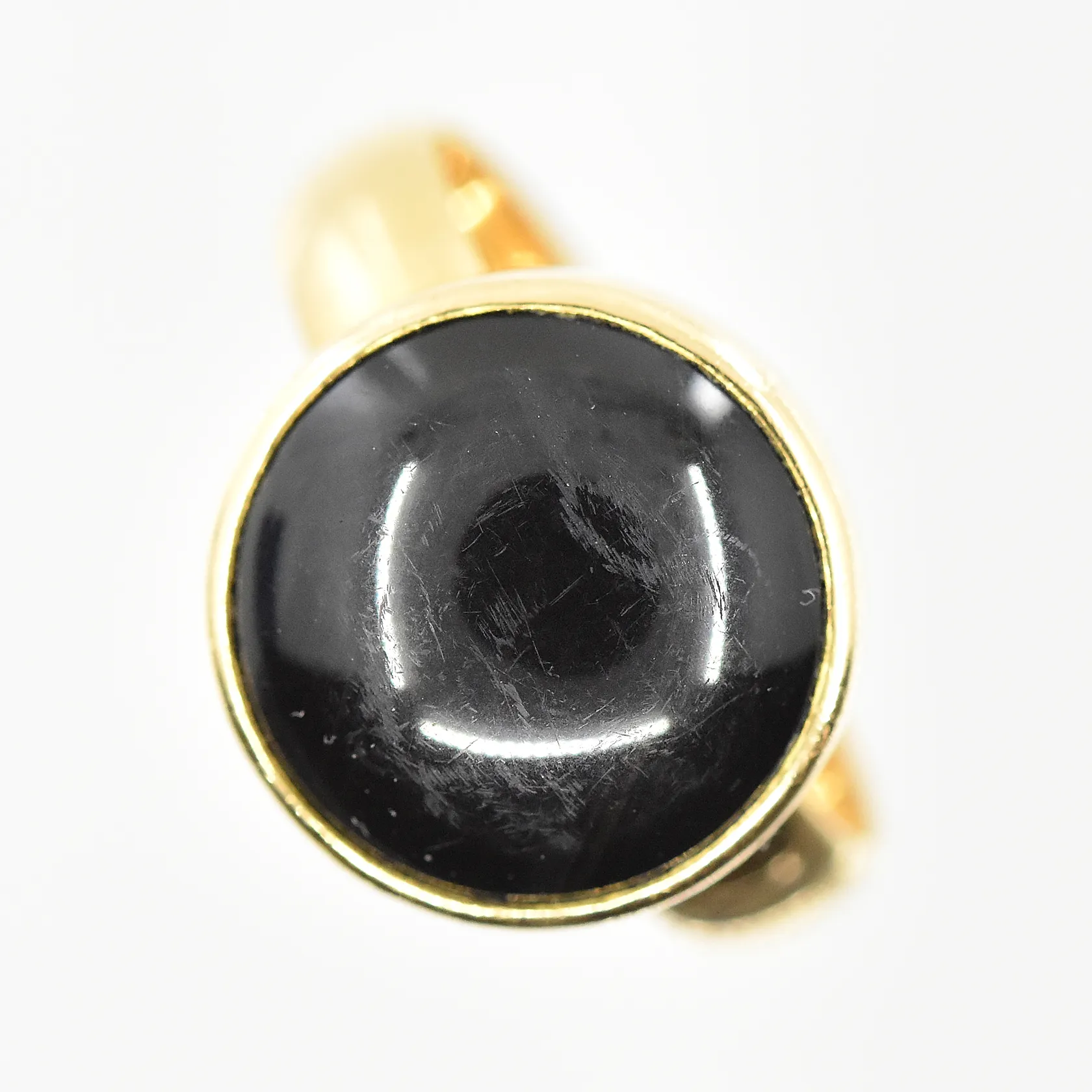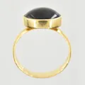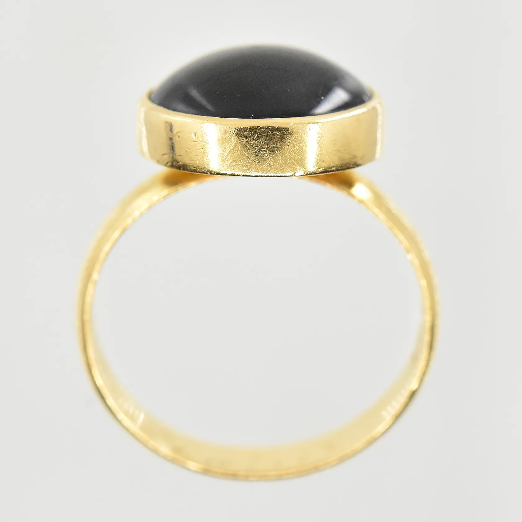 Ring med Onyx, Ø15 mm, stl 18¾, skenans bredd 4 mm, repig sten, 18K. Vikt: 8,7 g.