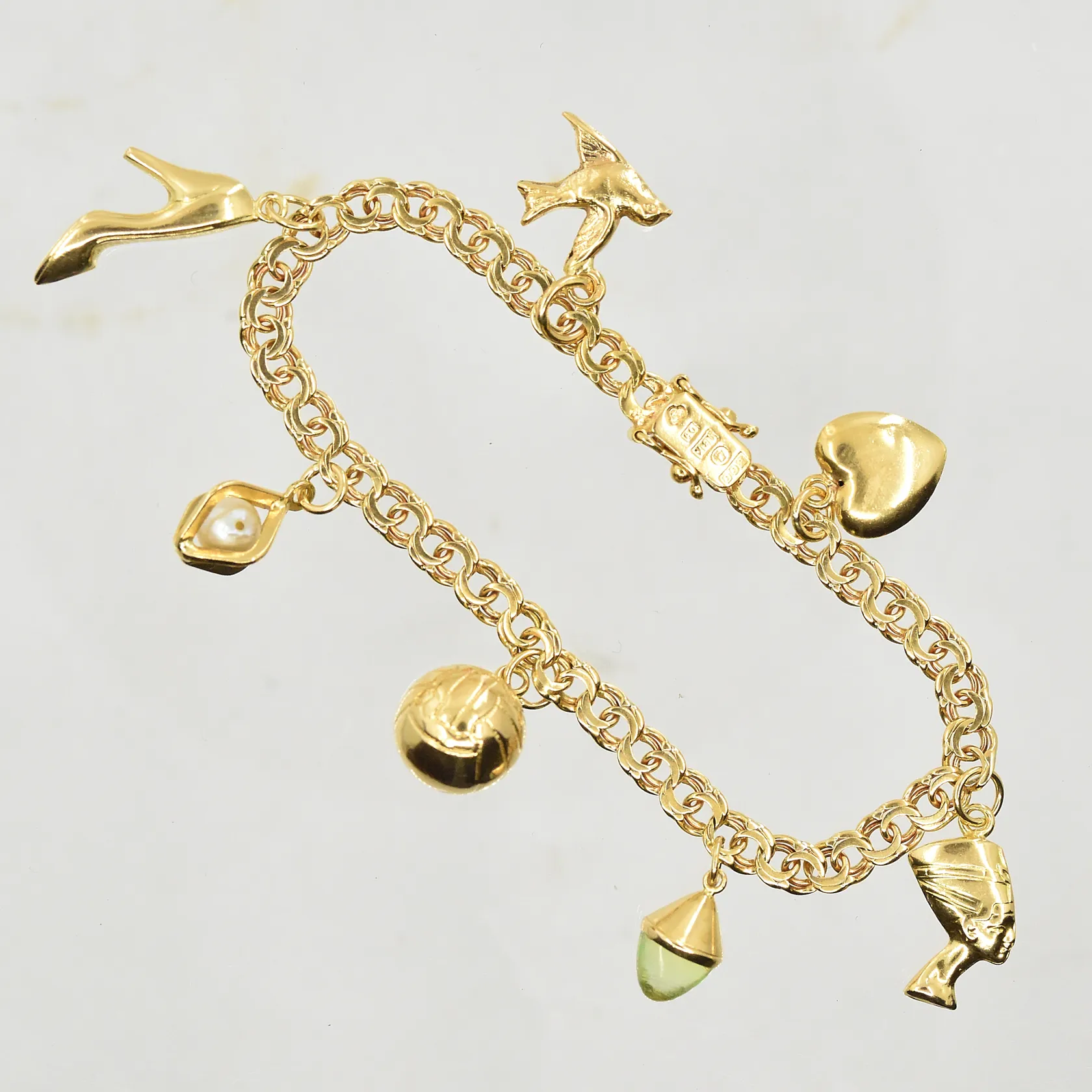 Armband Bismarck med 7 berlocker, längd 17½ cm, länkens bredd 5 mm, 18K. Vikt: 13,9 g.