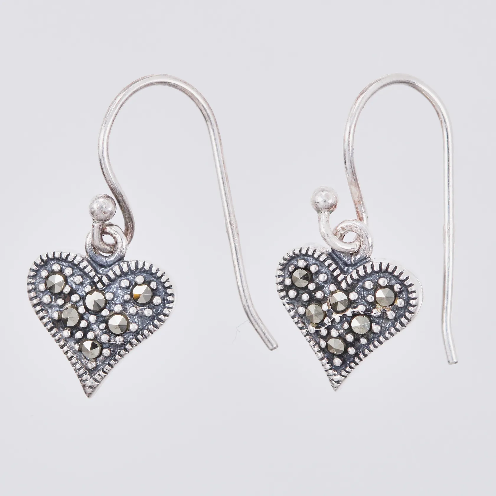 Ett par örhängen hjärtan med markasiter, längd: ca 2cm, bredd: ca 10mm, GHA, 925/1000, silver Vikt: 1,9 g.