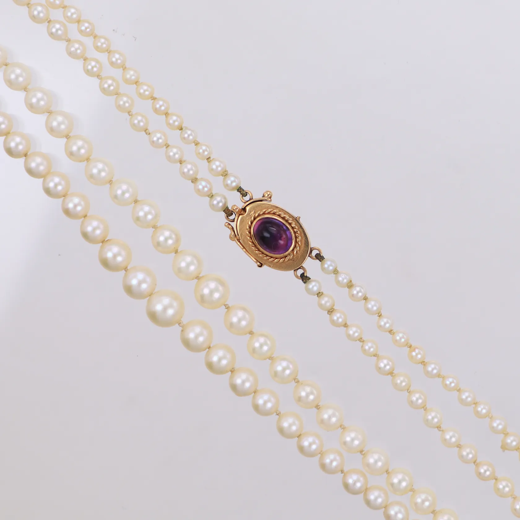 Pärlcollier tvåradigt med odlade pärlor, Ø3,6-7,7mm, längd ca 43cm, lås med cabochonslipad ametist, Guldsmide N Stridh Atelier, Karlskrona år 1963, en låsåtta saknas, 18K Vikt: 29,1 g.