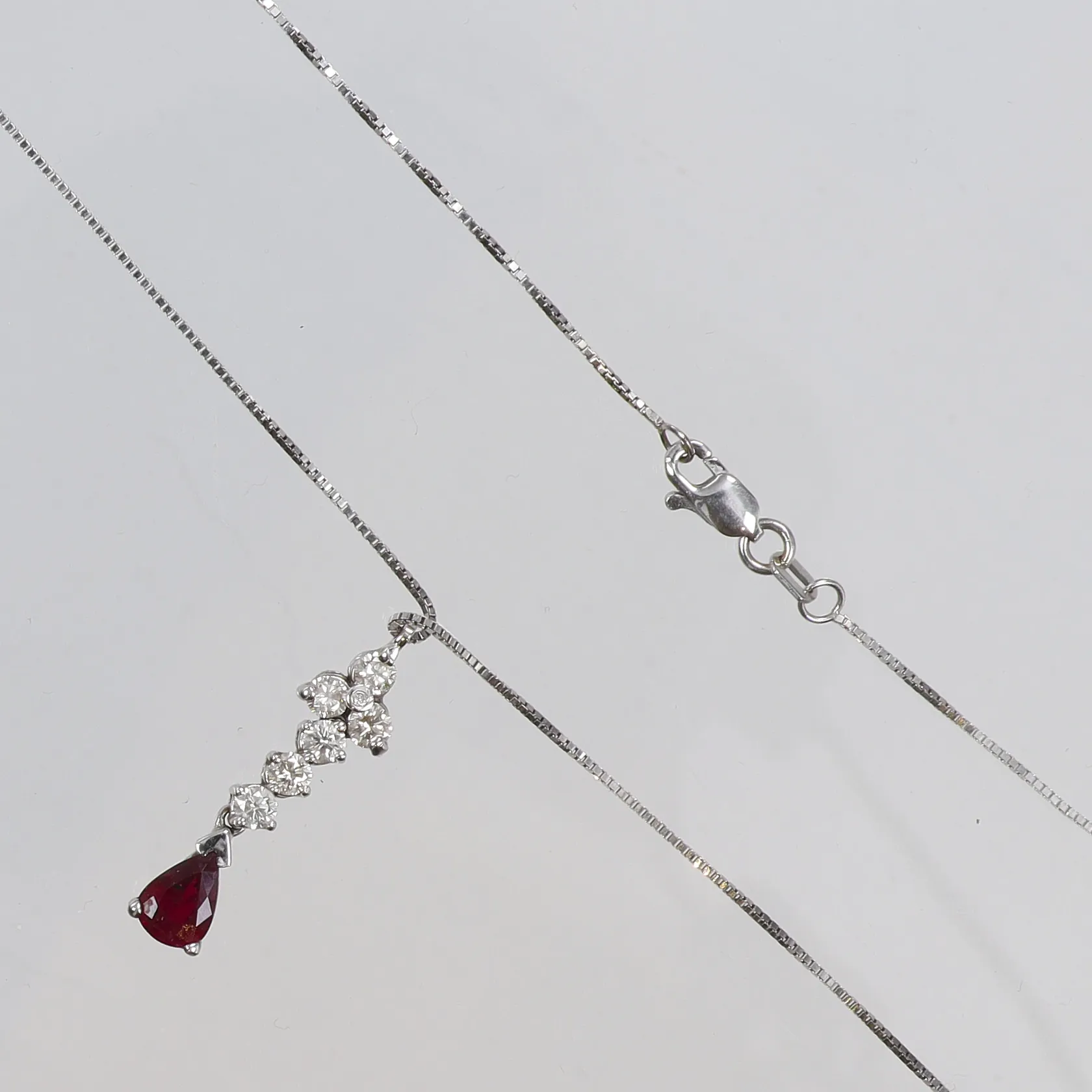 Collier Venezia i vitguld med integrerat hänge med röd sten samt diamanter 6ca0,08ct samt 1xca0,005ct, längd 48cm bredd ca 1mm, hänge längd 25mm, 18K Vikt: 4,1 g.