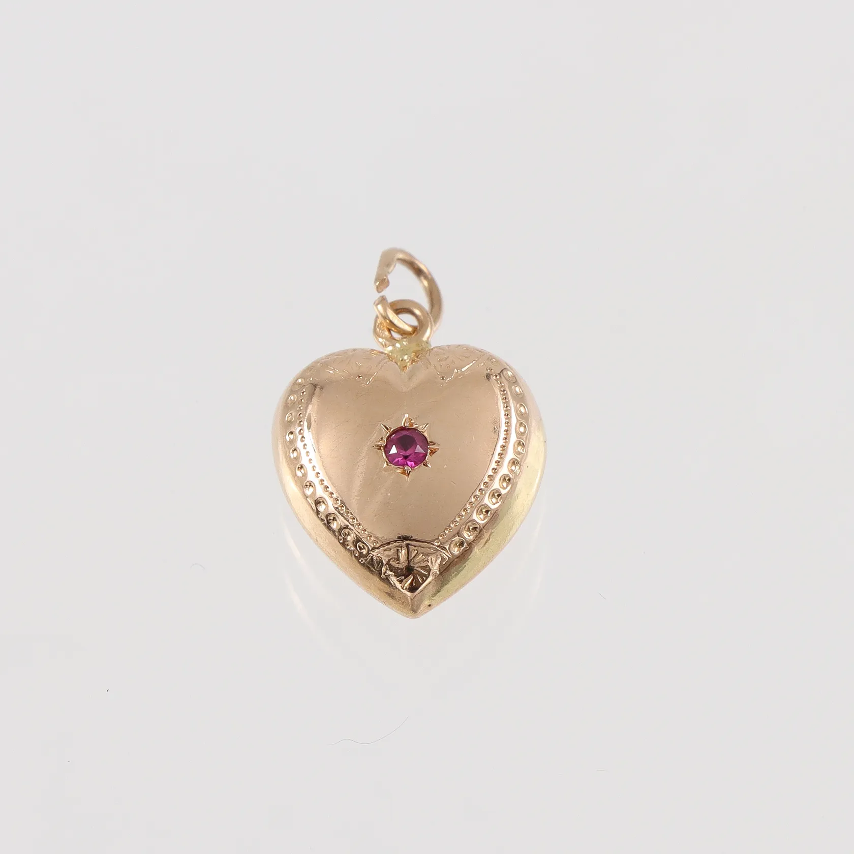 Berlock " Hjärta lite mönstrat med röd sten 18k, öppen ögla, höjd ca 13mm Vikt: 1,2 g.