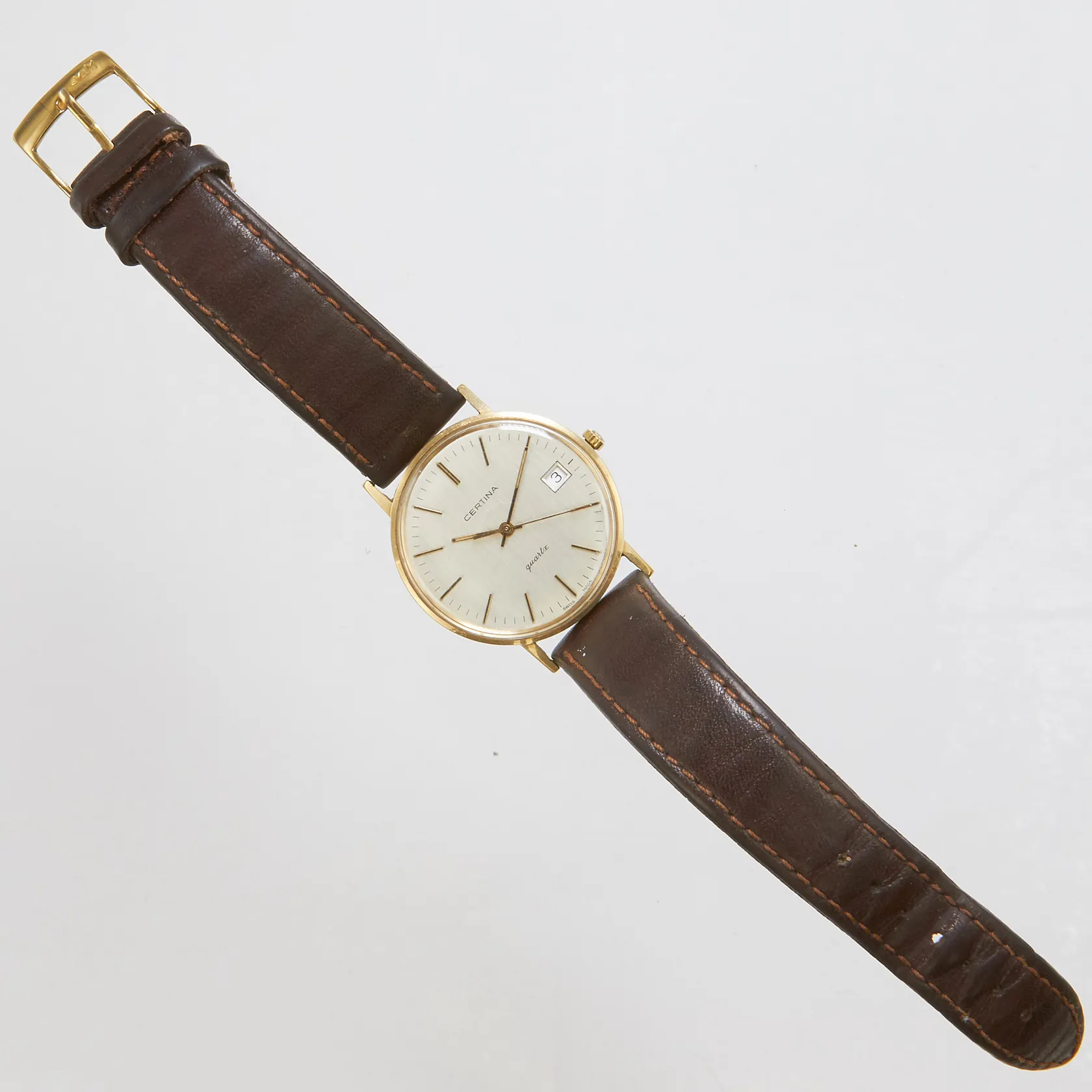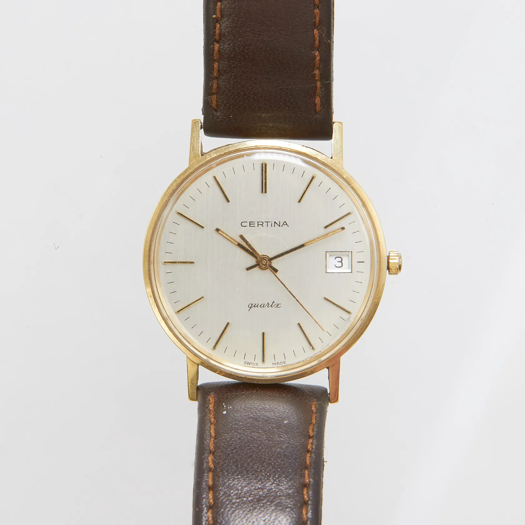 Herrur Certina 14K, Ø34mm, quartz, datum, slitet läderarmband, gravyr, inga övriga tillbehör.