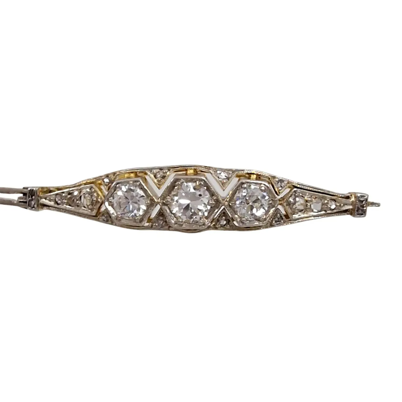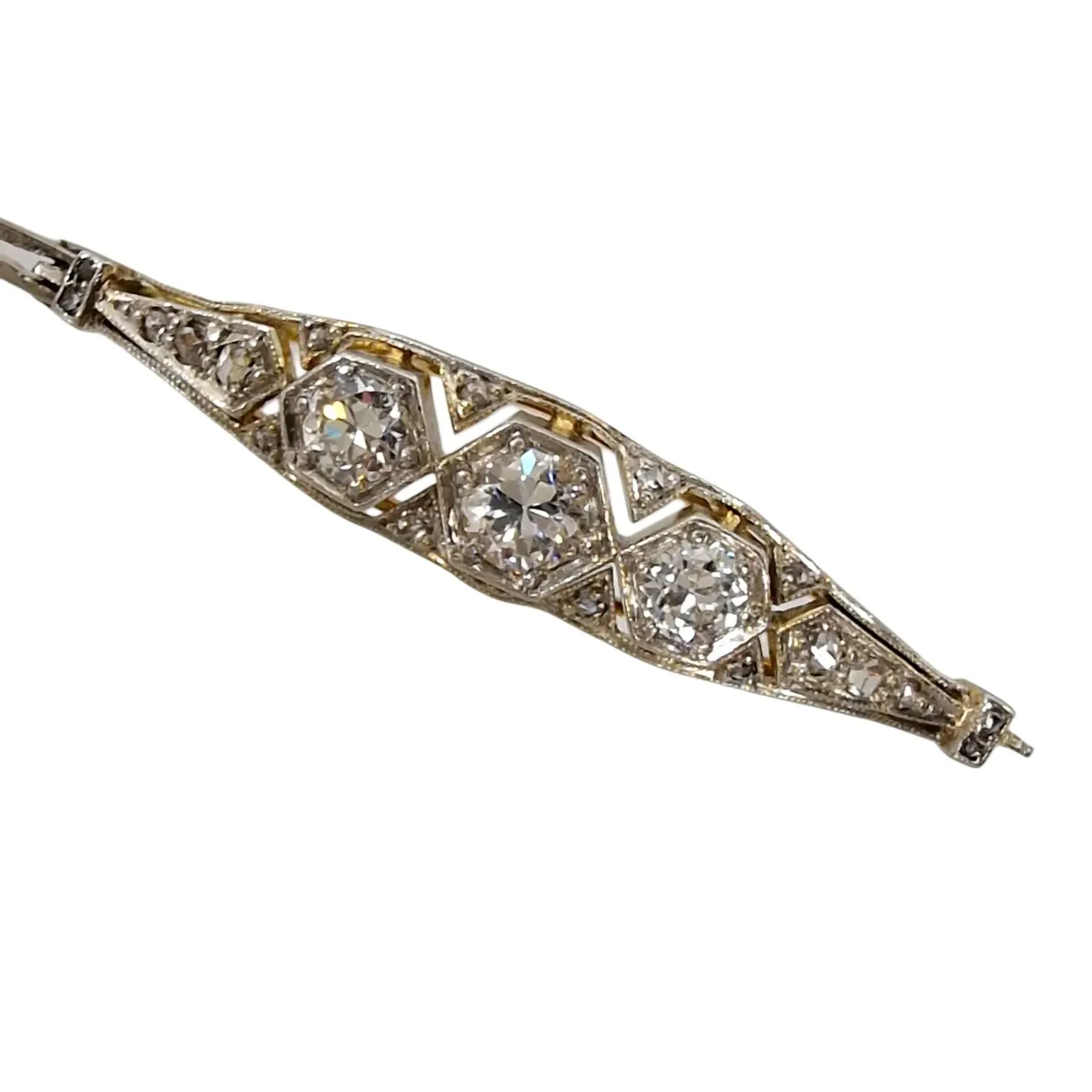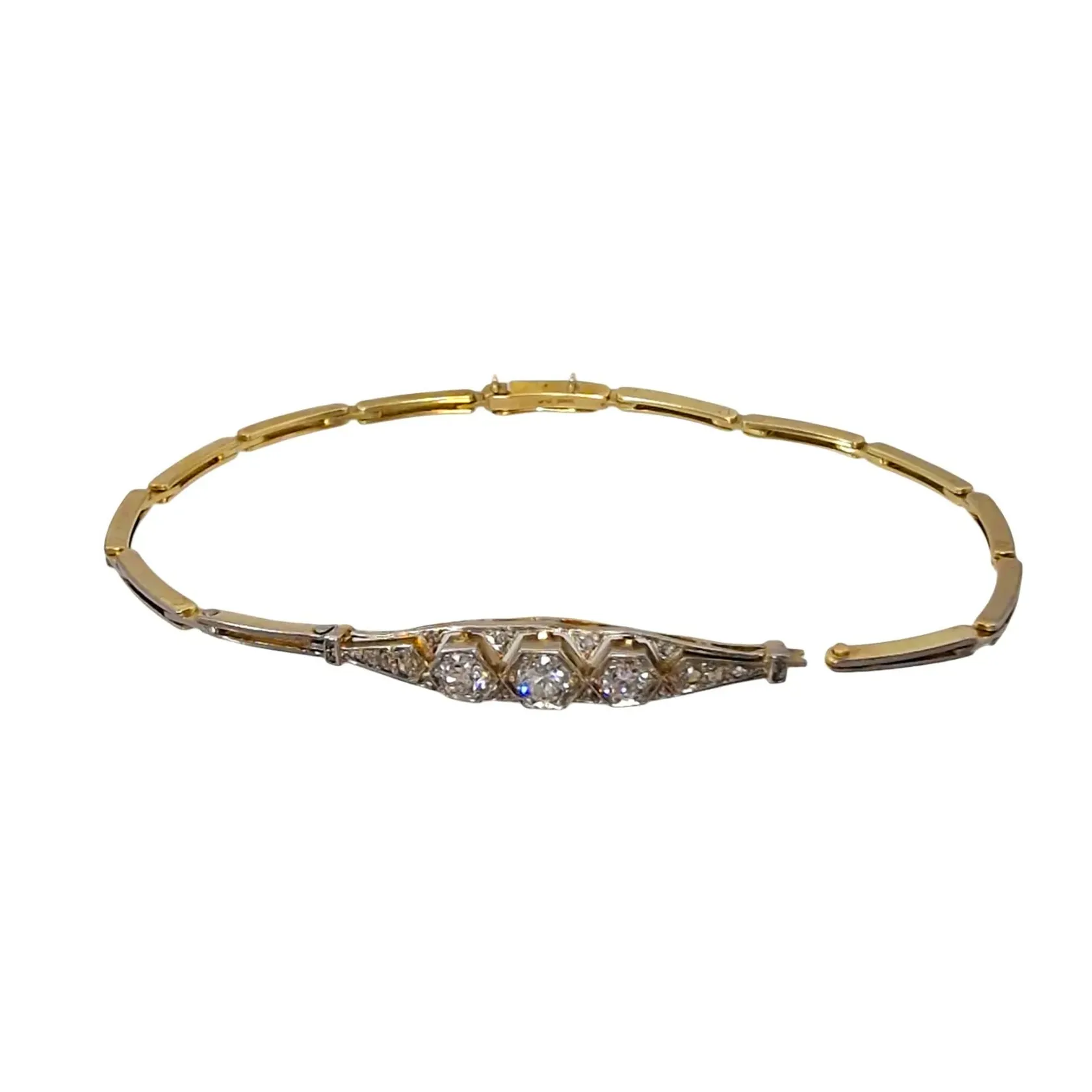 Diamantarmband 14K guld Diamanter 0,15ct + 0,20ct + 0,15ct gammalslipade 18 Rosenstenar, stämplar 585 och D. A, längd 19,5 cm, bredd 2 - 6,5 mm, trasig länk, säkerhetskedja saknas, någon intryckning på mittdelen Vikt: 8,5 g.