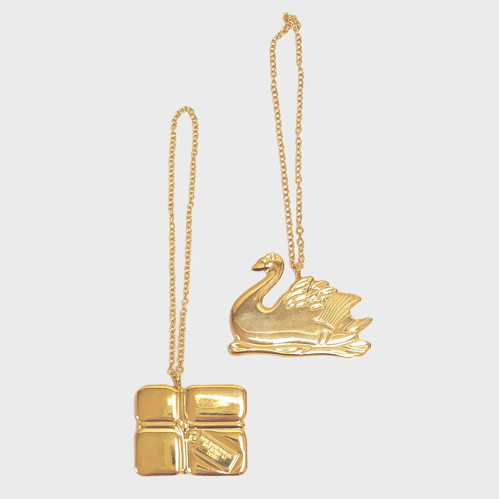 2 Juldekorationer, Georg Jensen, formgivna av Andreas Mikkelsen, Golden Christmas 2000, guldpläterad mässing, orginalförpackning.