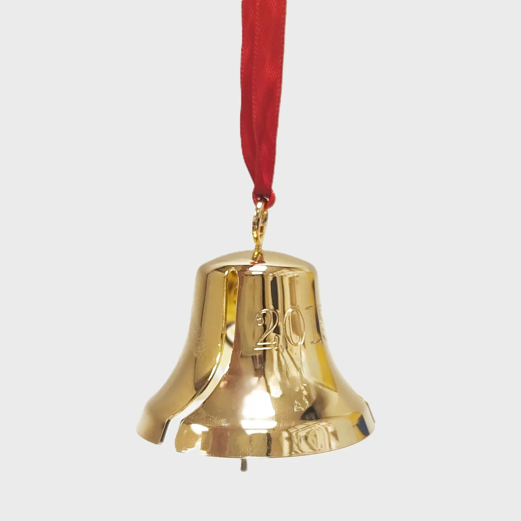 Juldekoration, Georg Jensen, årets julklocka 2015, guldpläterad mässing, rosa extrasnöre, skadad orginalförpackning.