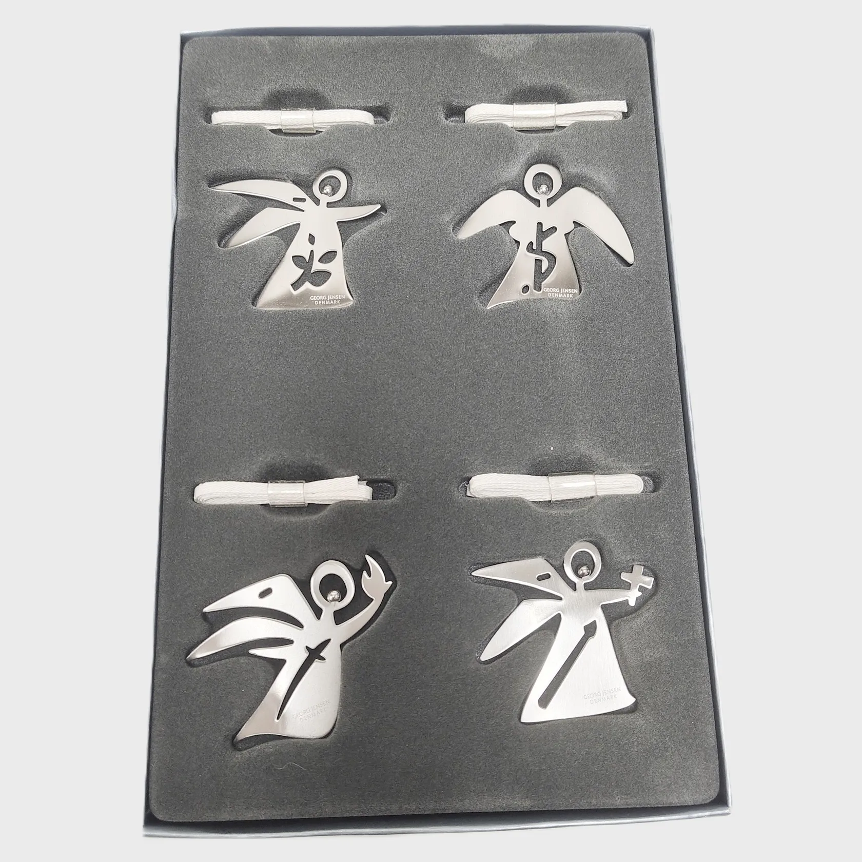 4 Juldekorationer, Georg Jensen, Archangels, Christmas Nordica, rostfritt stål, höjd ca. 4,5cm, orginalförpackning.