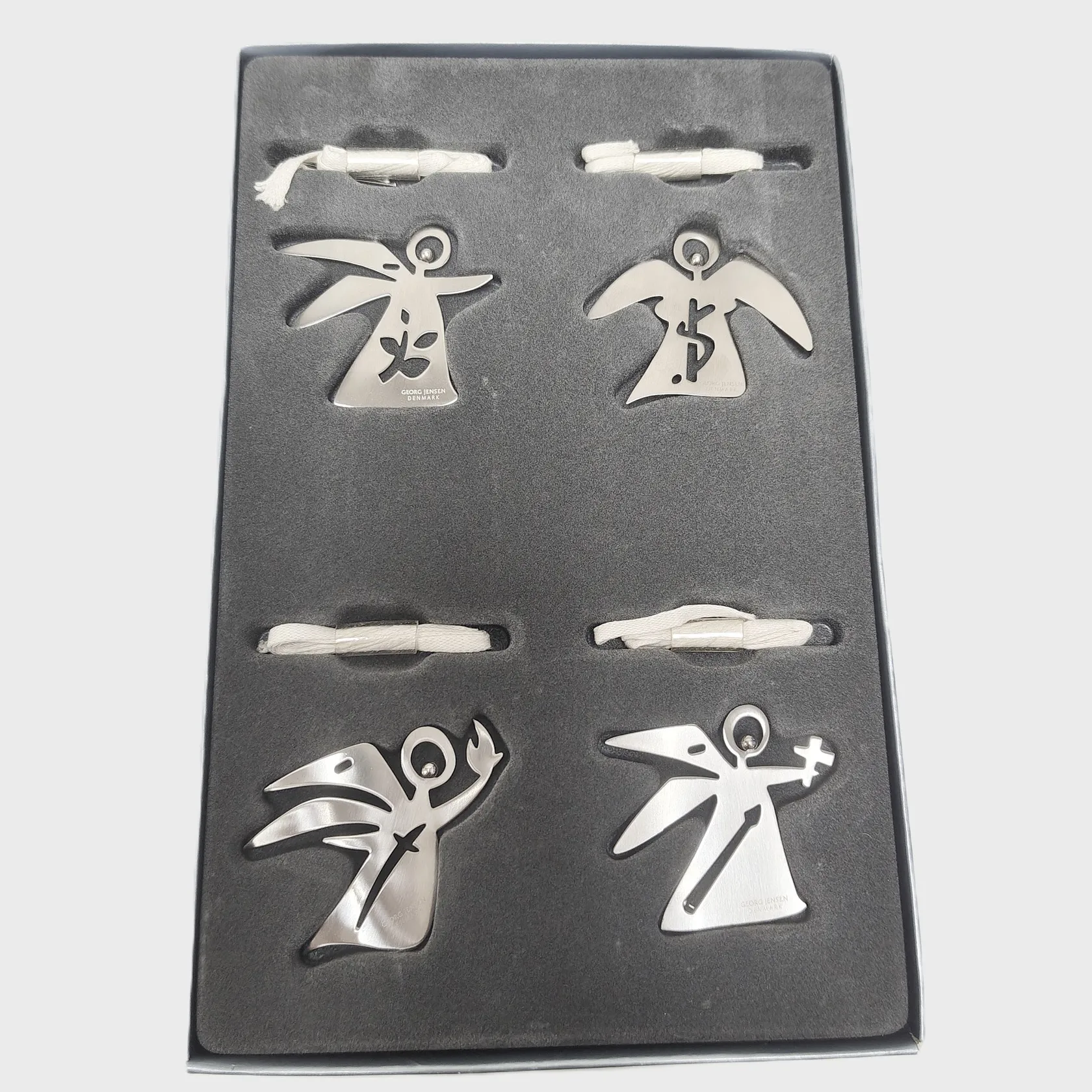 4 Juldekorationer, Georg Jensen, Archangels, Christmas Nordica, rostfritt stål, höjd ca. 4,5cm, i orginalförpackning, varav ena med fläck.