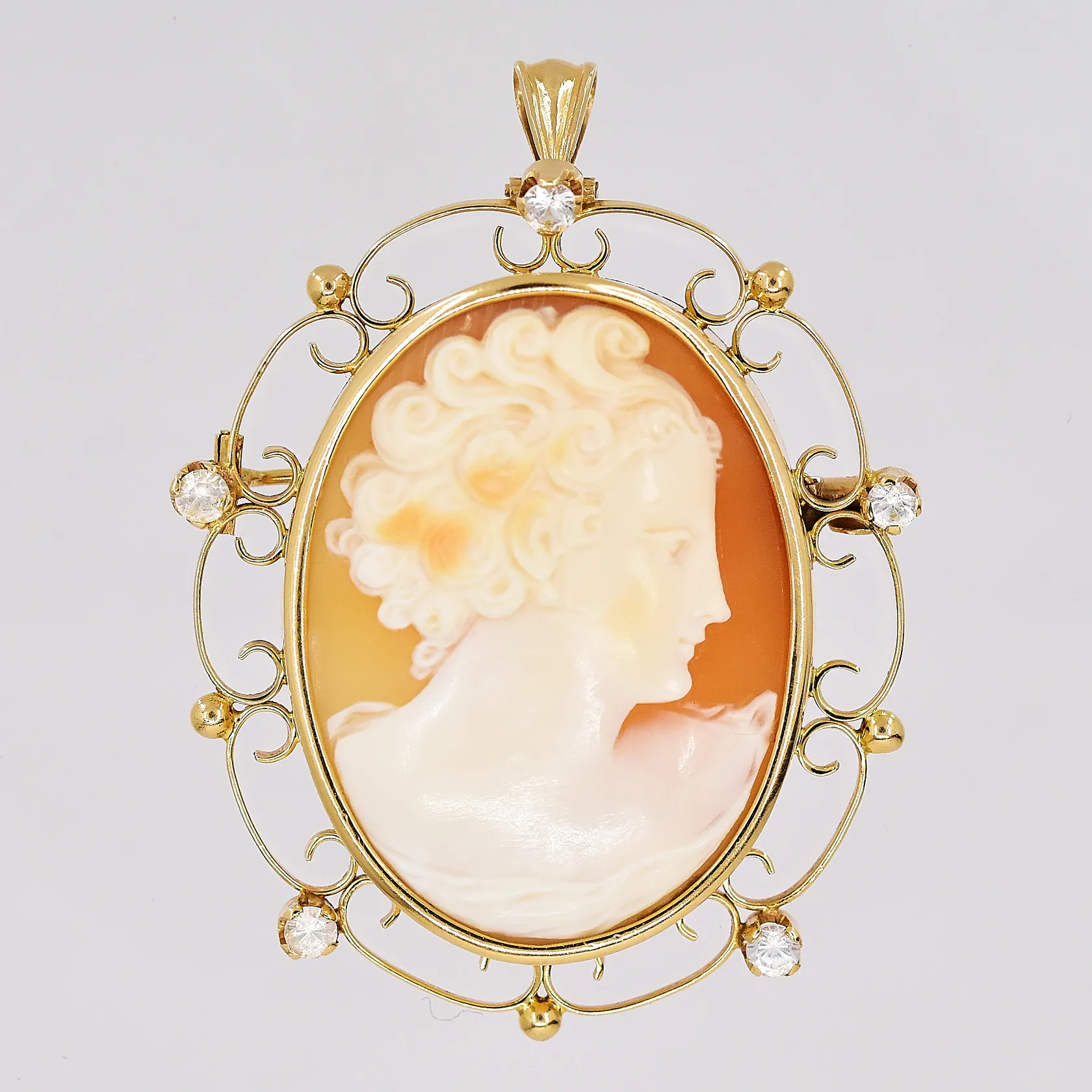 Hänge/brosch med Camé ca 39x52mm inklusive ögla, vita stenar, 18K, bruttovikt 11,7g Vikt: 11,7 g.