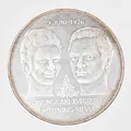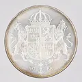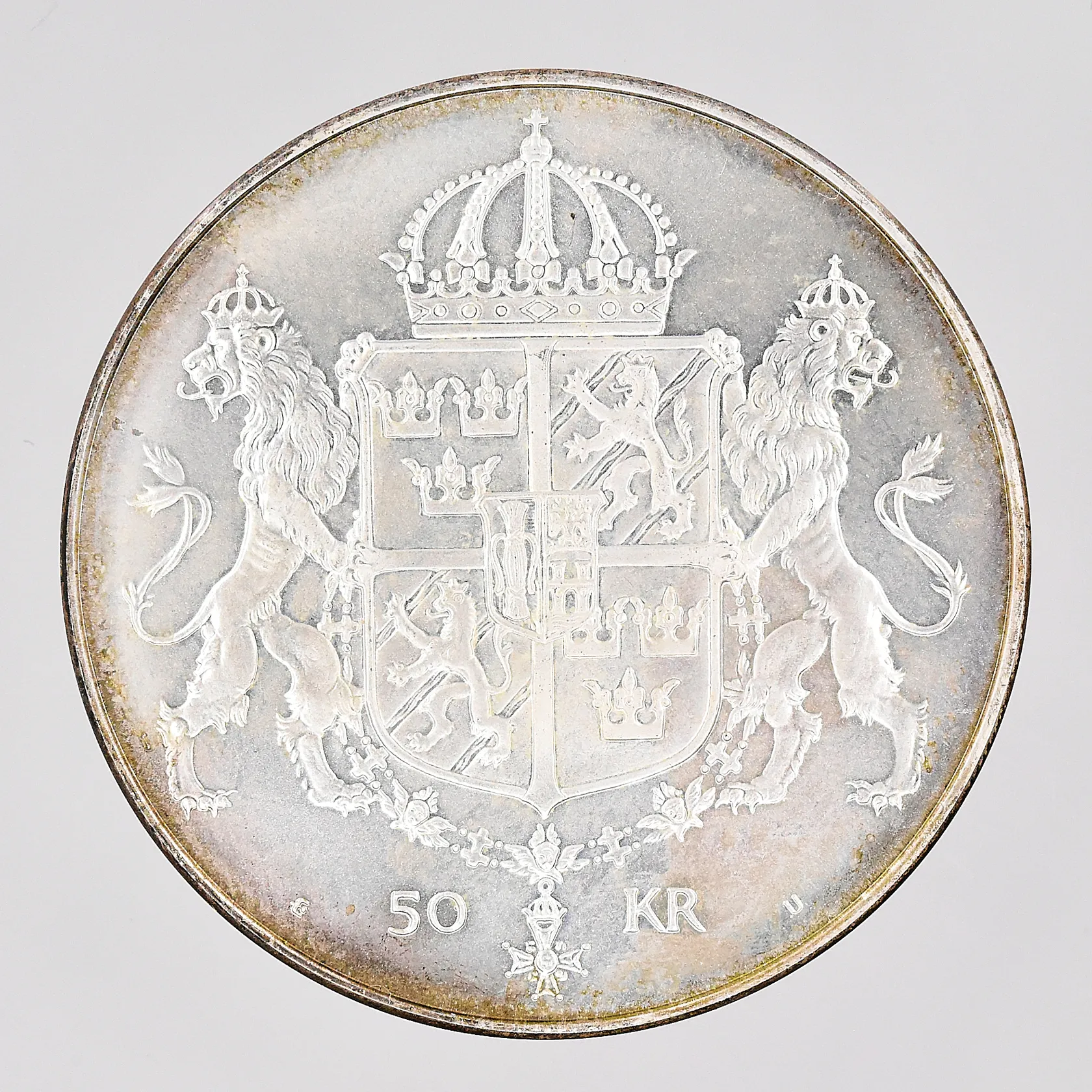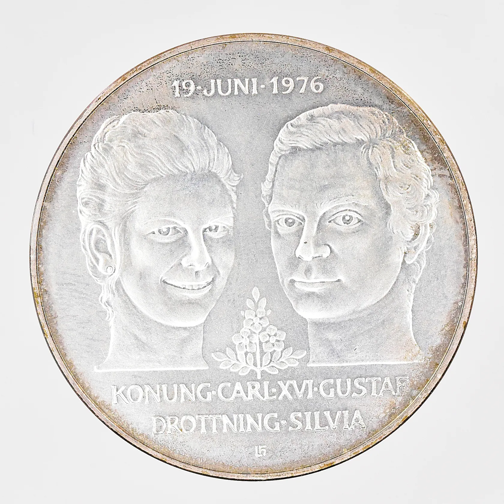 Samlarmynt, Ø 36mm, Konung Carl XVI Gustaf och Drottning Silvia, 19 juni 1976, nominellt värde 50kr, silver 925/1000 Vikt: 27 g.