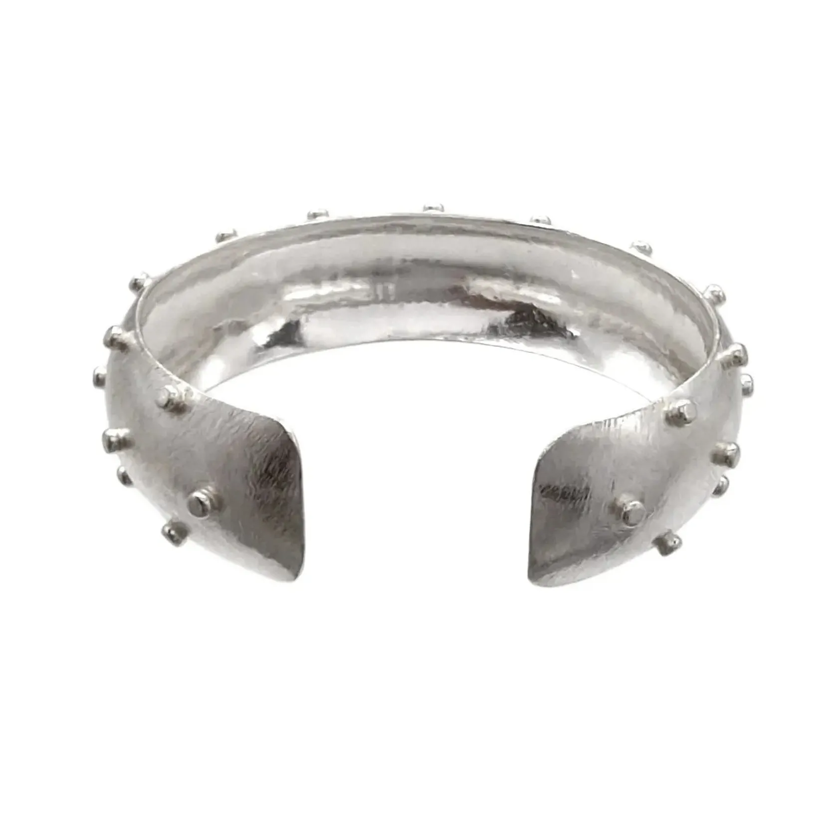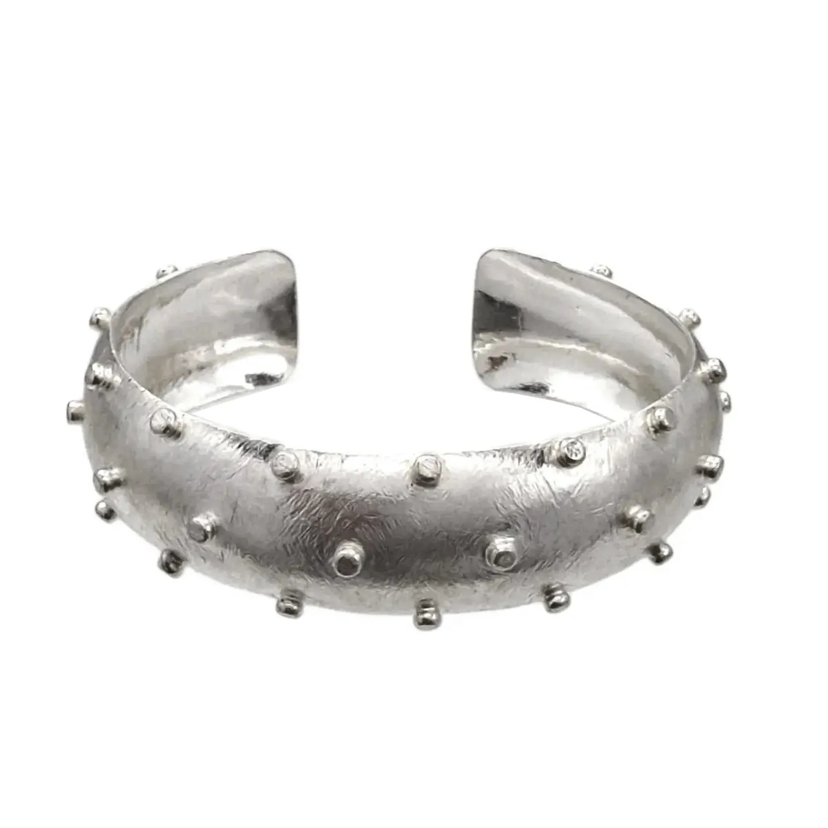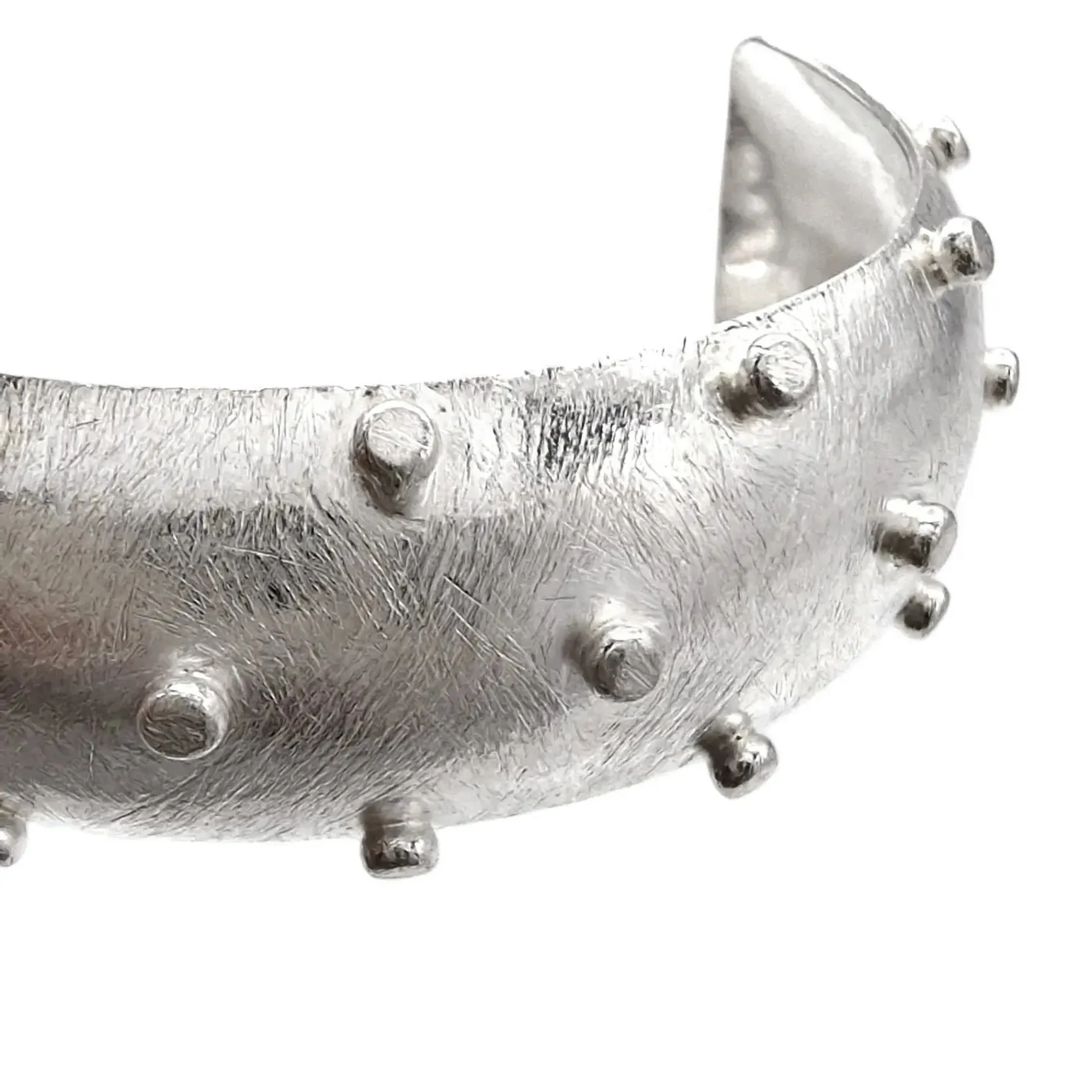 Armring design SUSANNE FRIIS BJØRNER Köpenhamn/Danmark, silver 925/1000, inre mått 17,5 cm, bredd 18 mm, utanpåliggande dekor, lätt borstad/strukturmönstrad yta, tillverkarstämpel SFB, fint skick, sparsamt använd Vikt: 29,2 g.