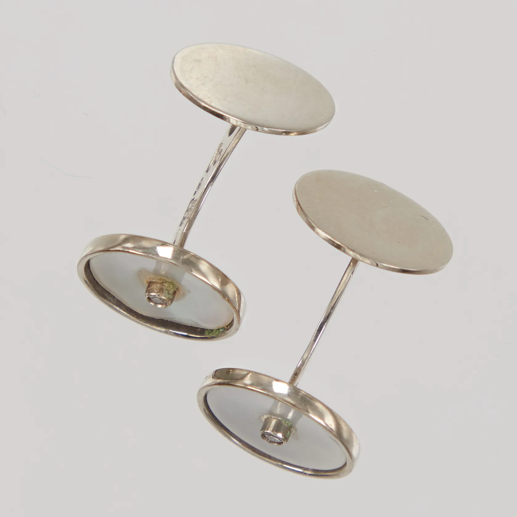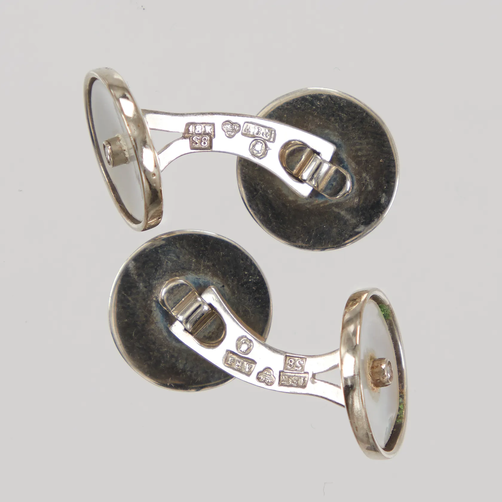 Ett par manschettknappar, Ø 13,9mm, pärlemor samt diamanter 2x ca 0,01ct, ABJ Juvelfabriken år 1944, vitguld 18K Vikt: 7,8 g.