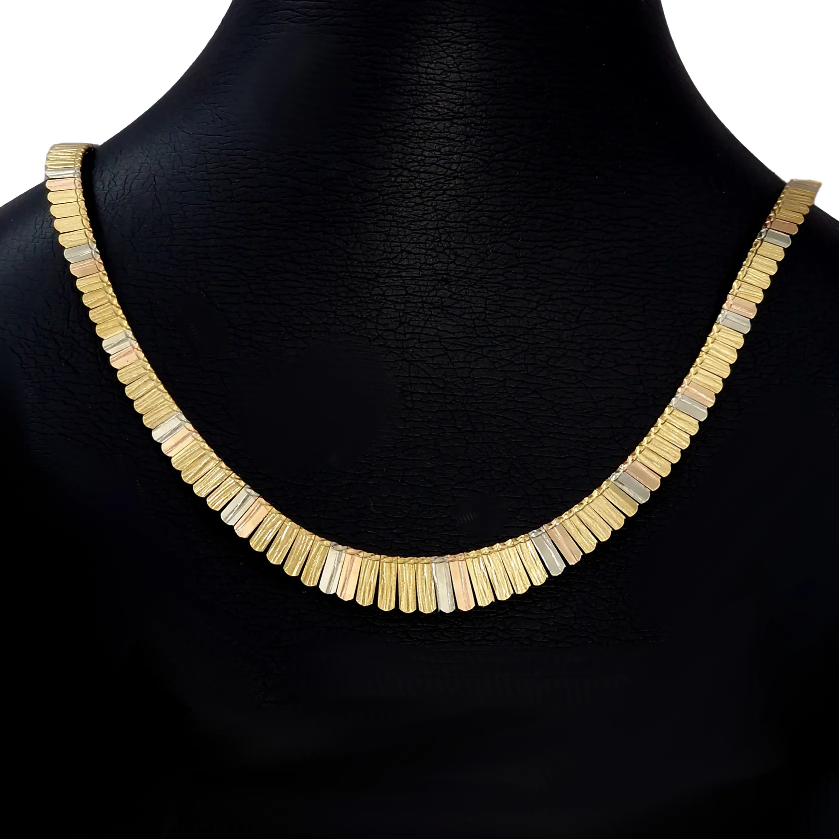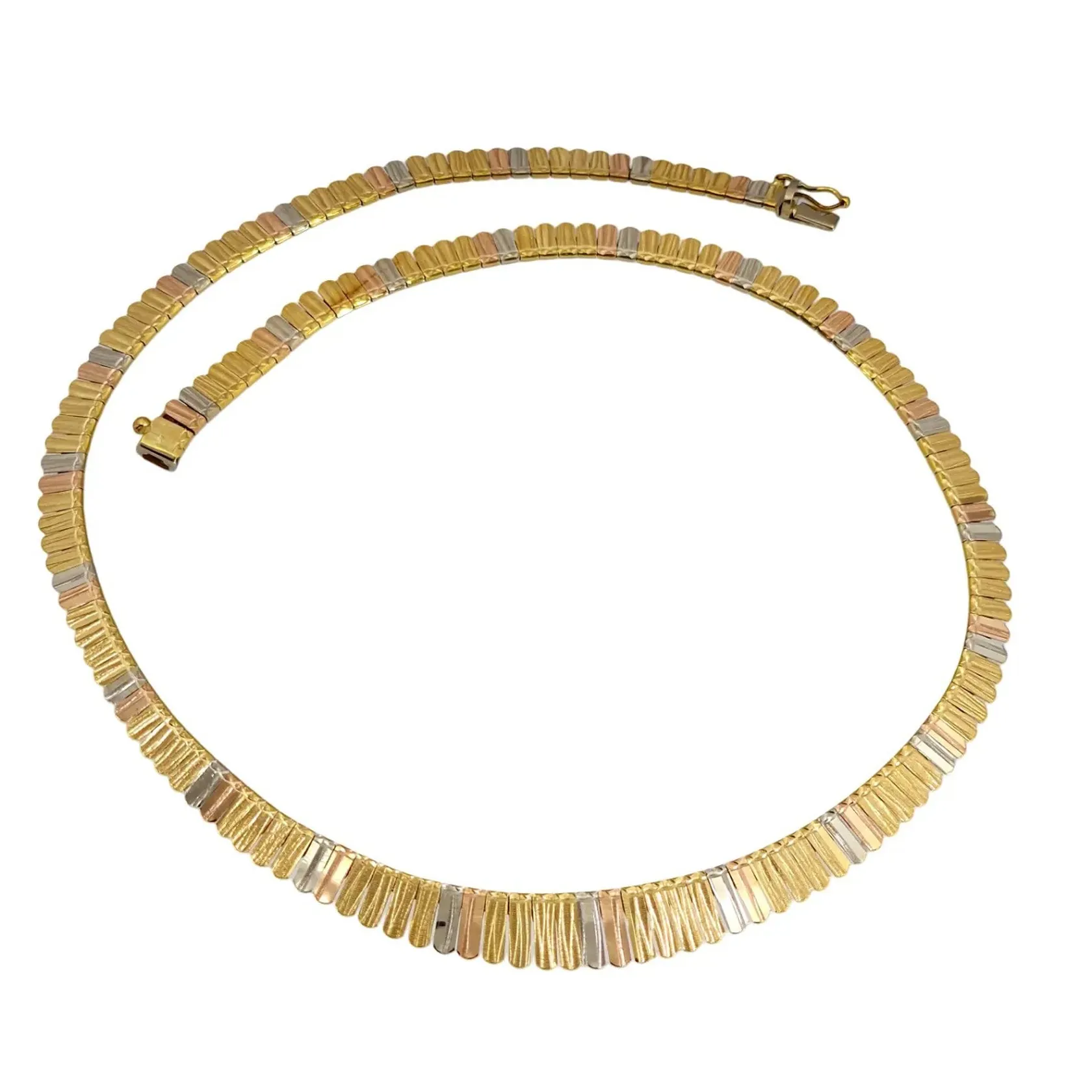 Collier 18K guld trefärgad modell, längd knäppt 42,5 cm, bredd 5,5 - 9,5 mm, fint skick Vikt: 29,4 g.