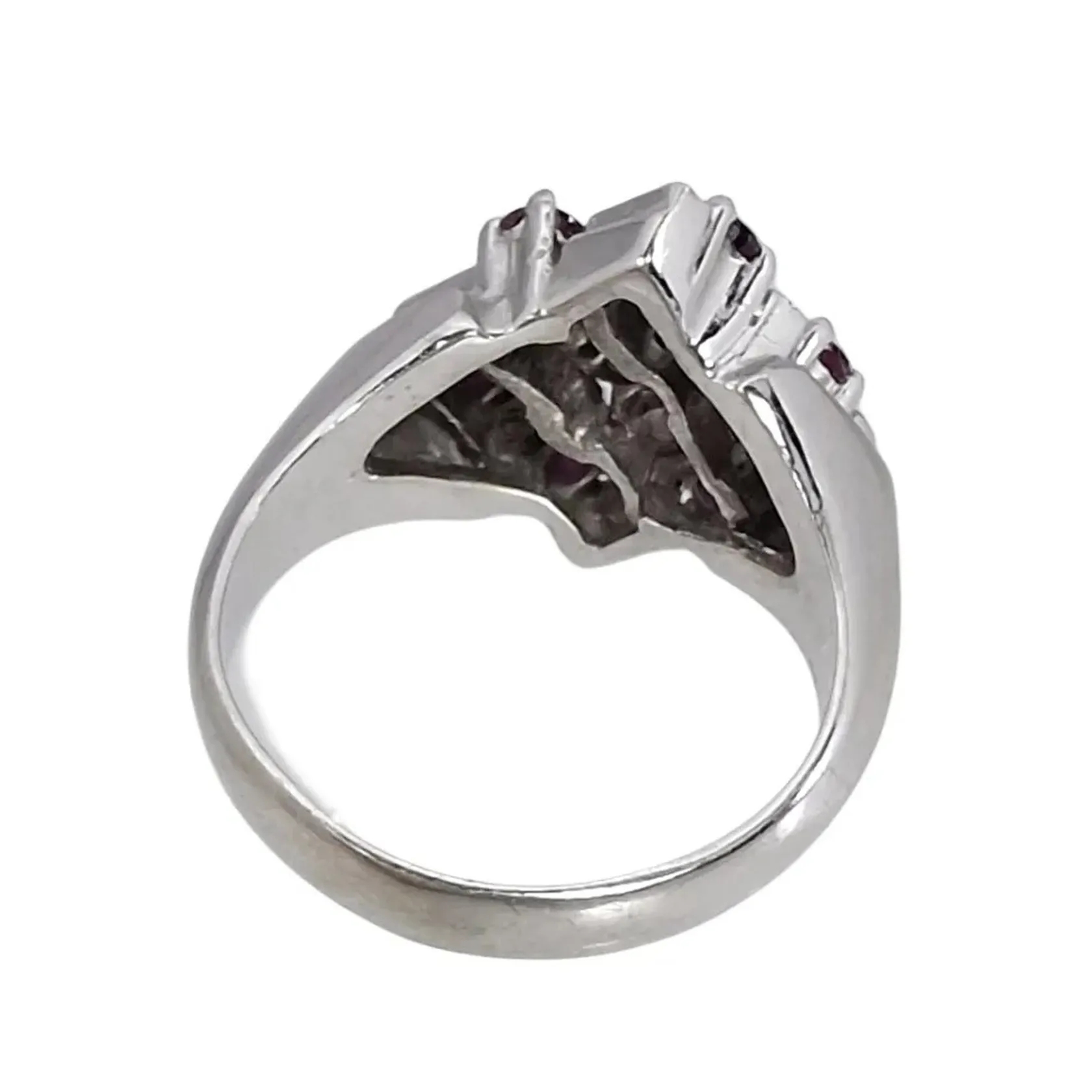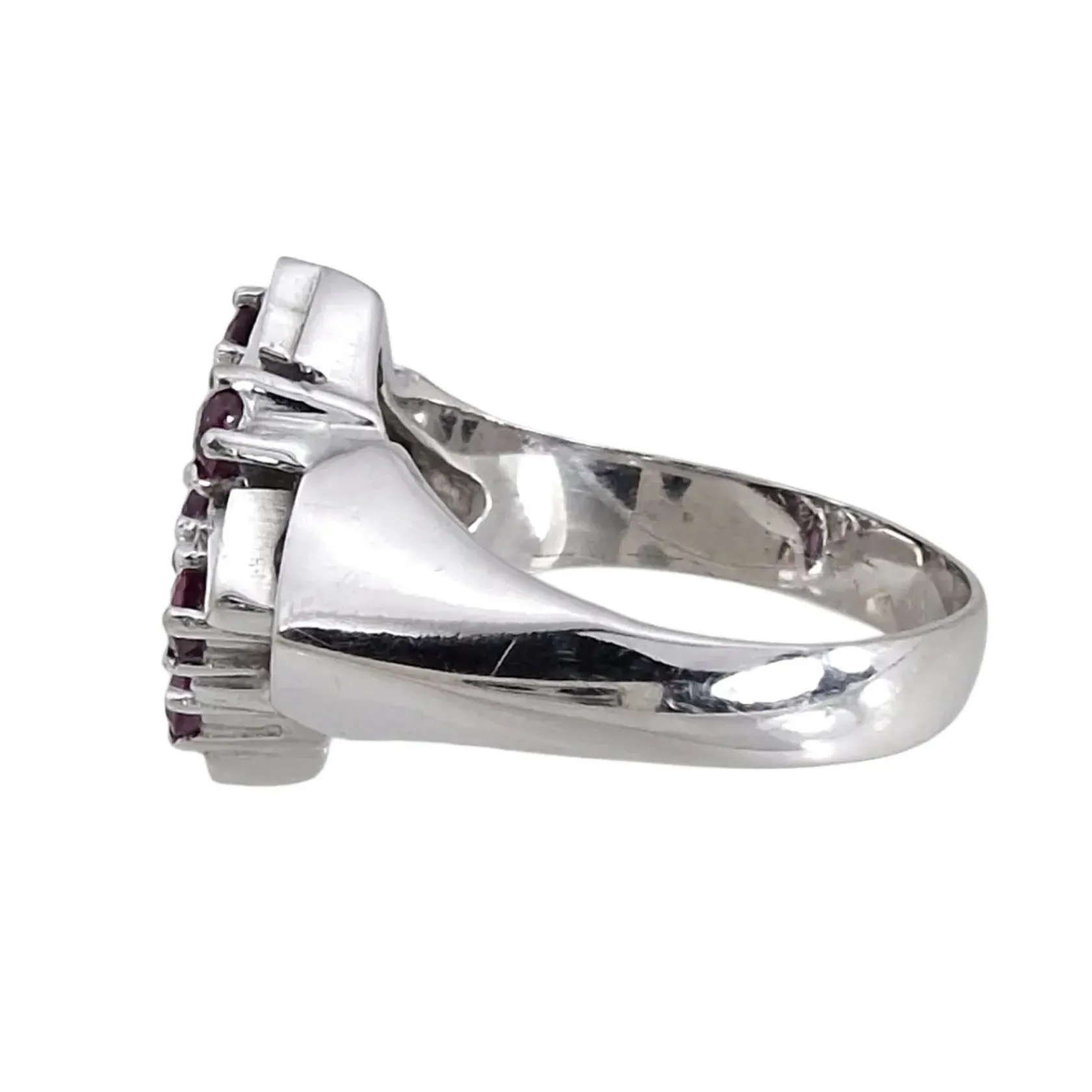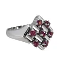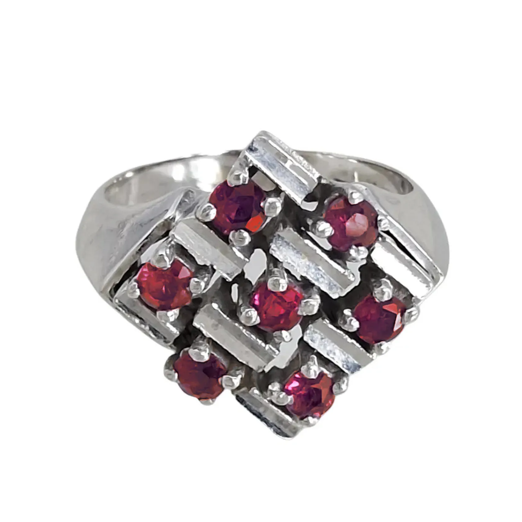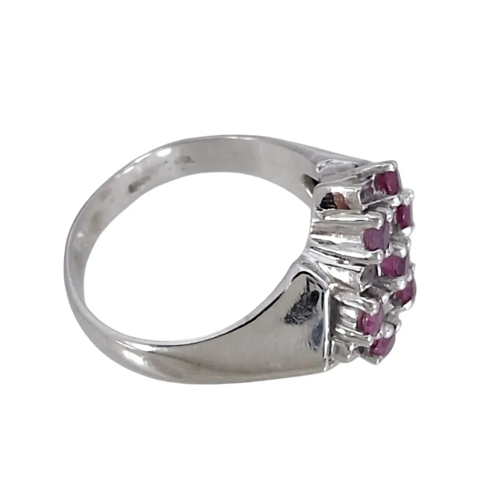 Ring 18K vitguld syntetiska Rubiner, 7 st, Ø 2,5 mm, svensk kontrollstämpel, Ø16¾ mm, bredd 3-15 mm, frontens storlek 15x15 mm, fint skick Vikt: 6 g.