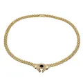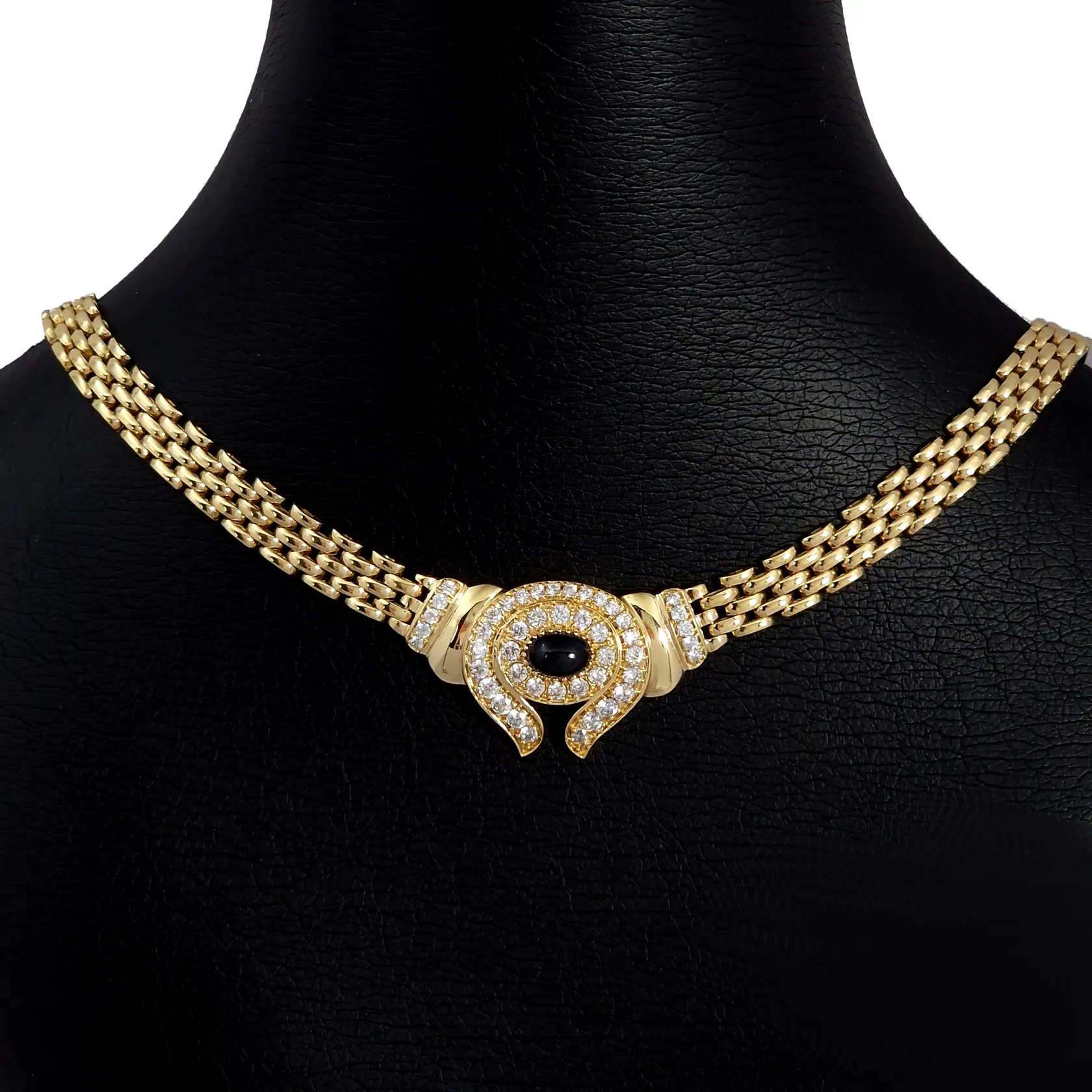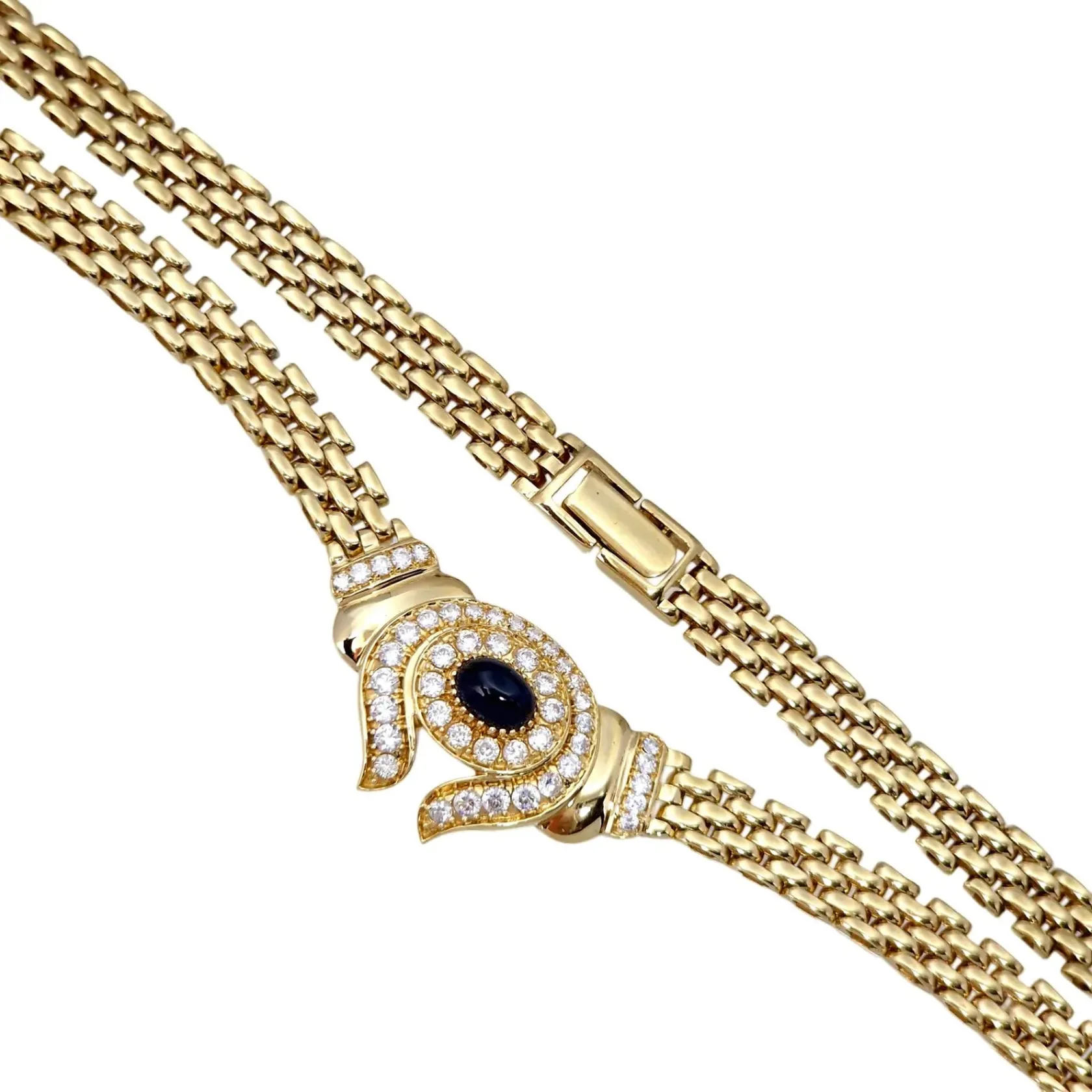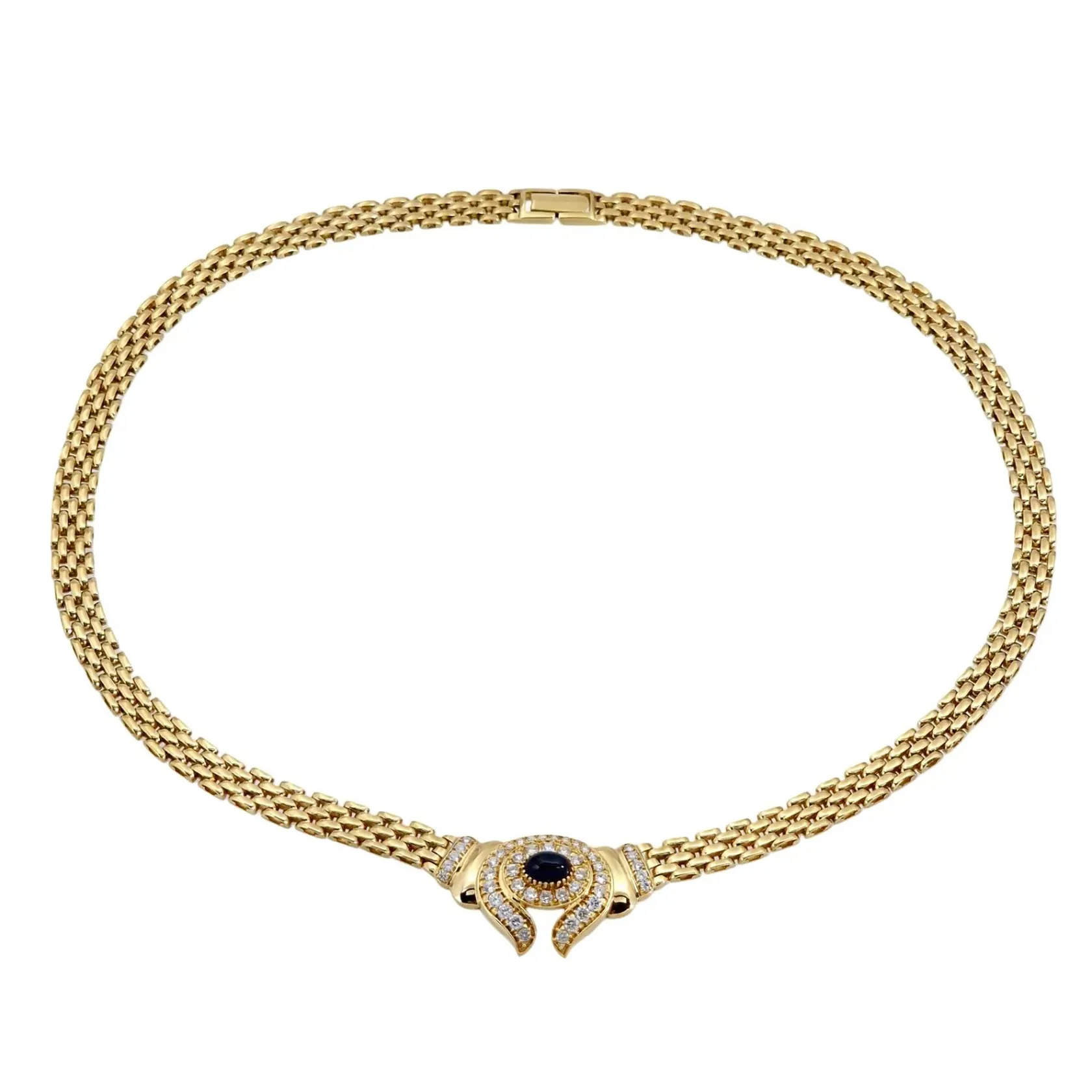 Collier 14K guld Safir 4,7 x 7 mm, cubic zirconia, tillverkarstämpel ASG, längd 45,0 cm, kedjans bredd 7 mm, mittdelens storlek 20 x 33 mm, mycket fint skick, stenar utan anmärkning Vikt: 40,4 g.