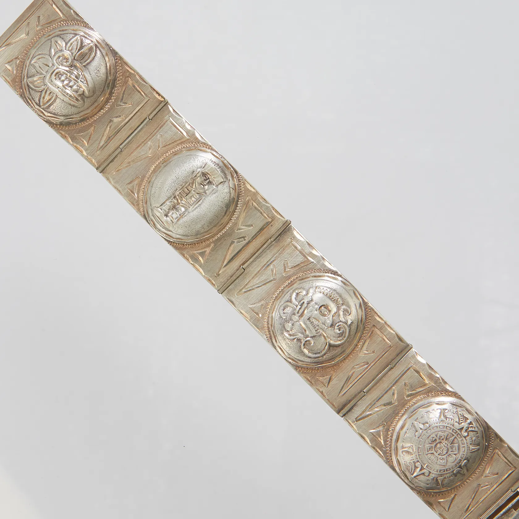 Silverarmband, aztekiska motiv, längd:17,5cm, bredd:25,5mm, bucklor, 925/1000. Vikt: 43,8 g.