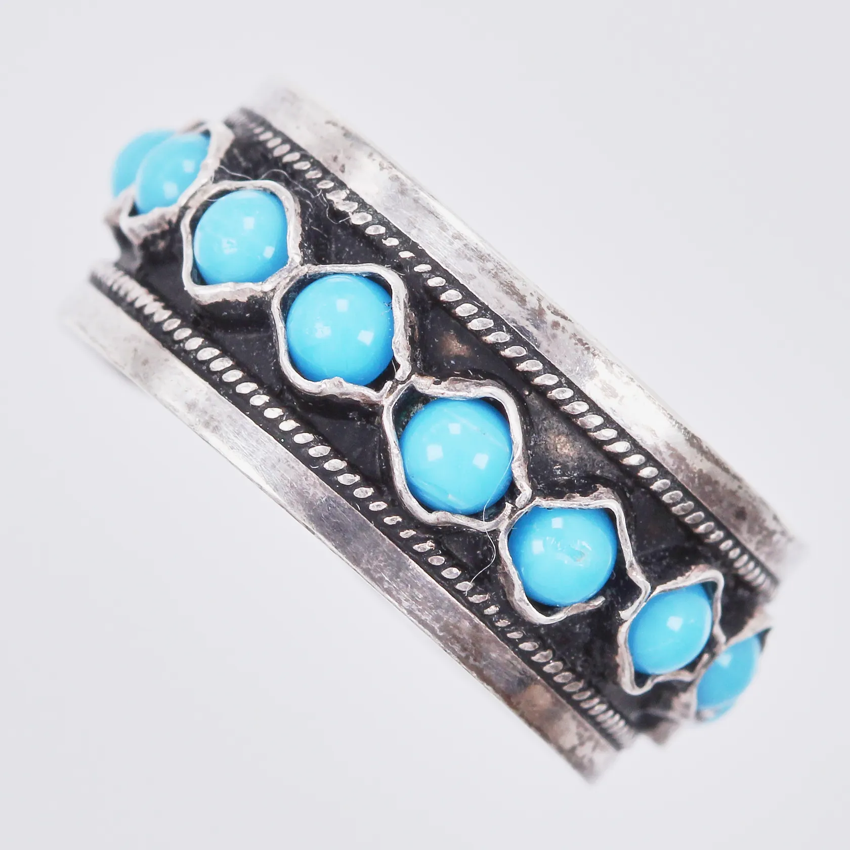 Ring med turkos, stl ca 18, bredd ca 9mm, justerbar, 935/1000 silver Vikt: 2,8 g.