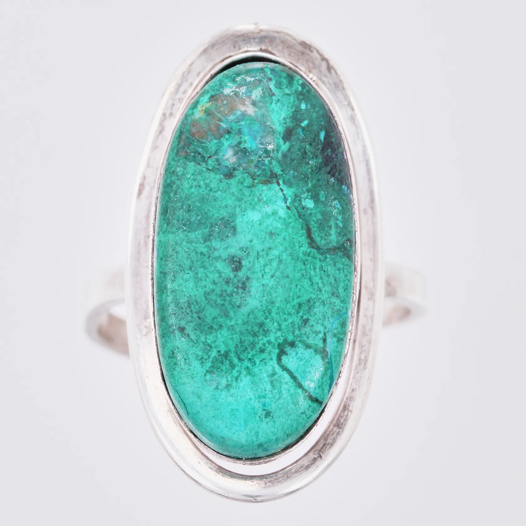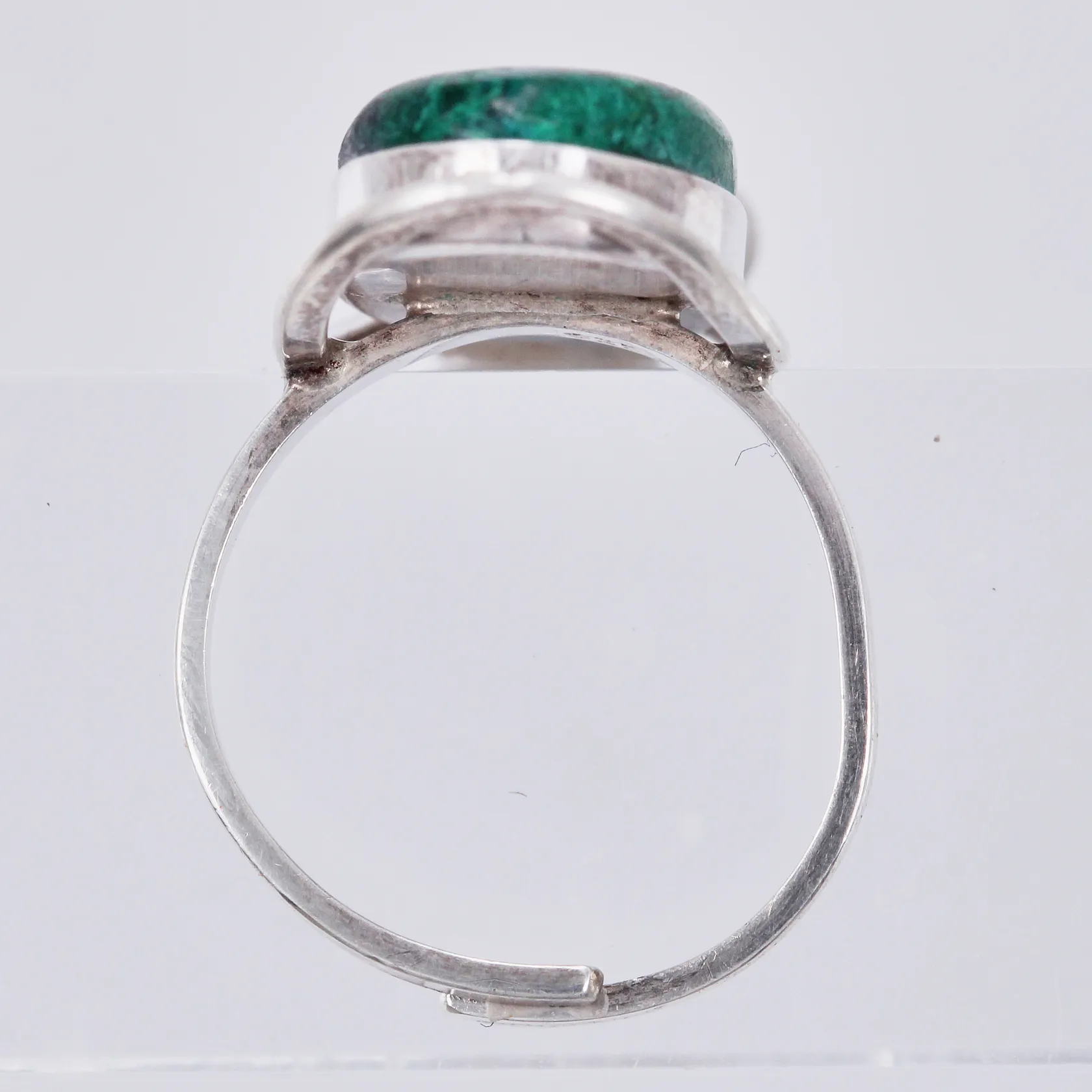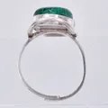Ring med grön sten, stl ca 16¼, bredd ca 2-25mm, justerbar, 925/1000 silver Vikt: 5,3 g.