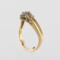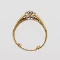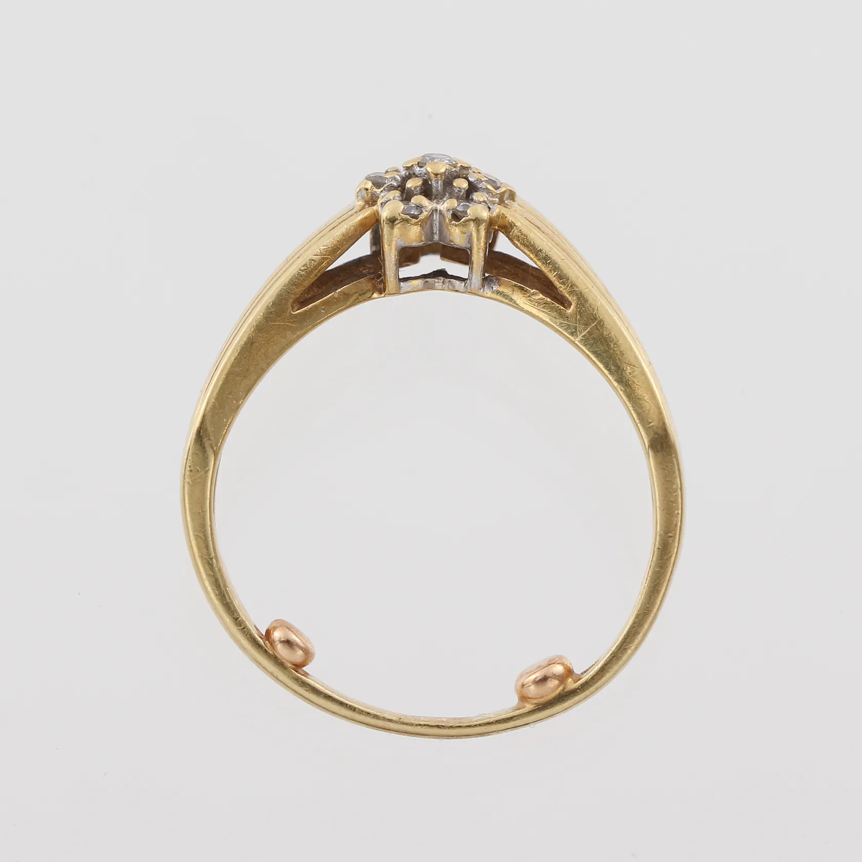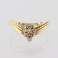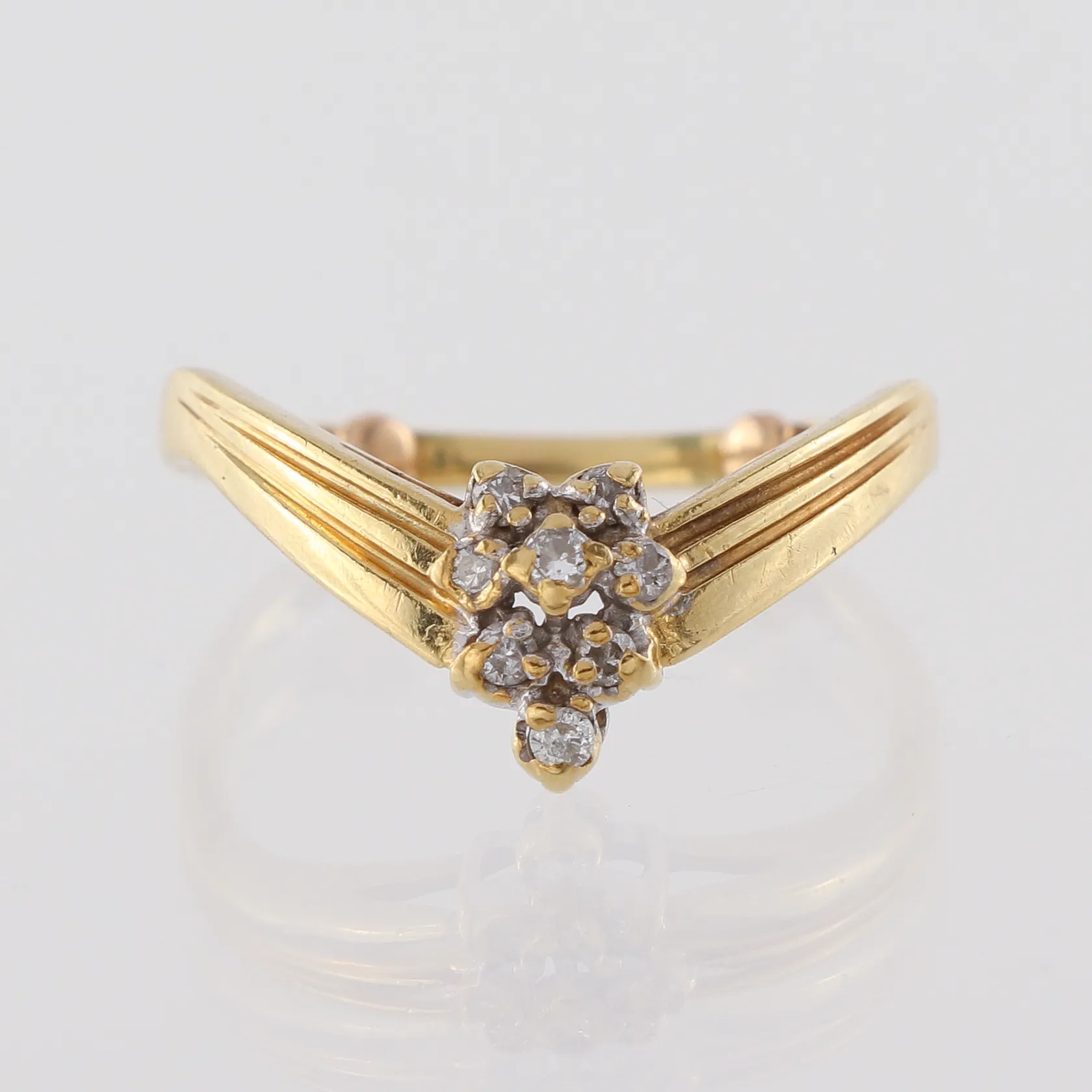 V-Ring med diamanter ca 8x0,01ct, storlek 15.5 mm förminskad med inlägg som troligtvis kan tas bort, bredd 1.4-8 mm, 18K. Vikt: 2,8 g.